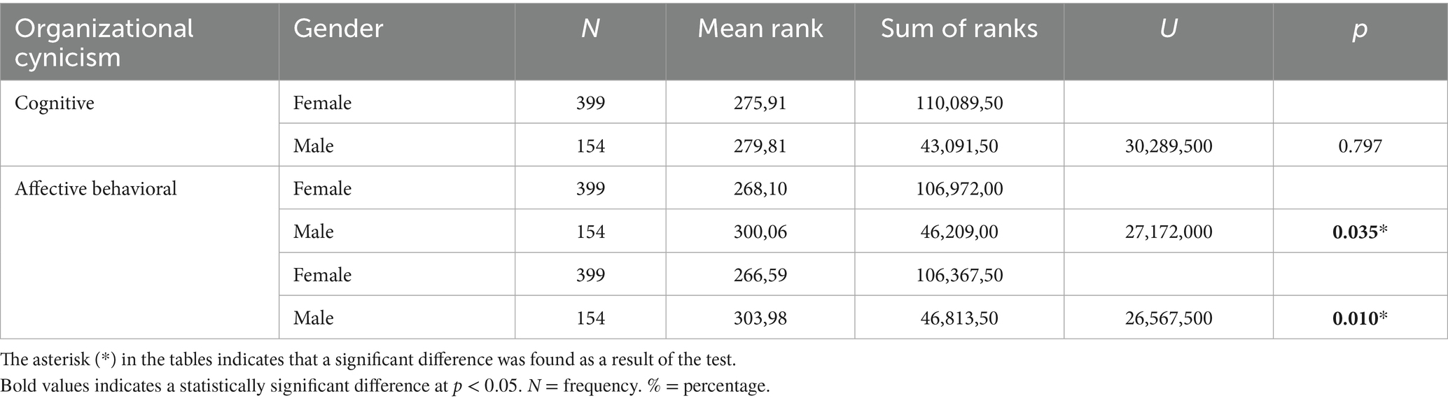 Table 8. Mann–Whitney U-test results on organizational cynicism score differences of participants’ gender.