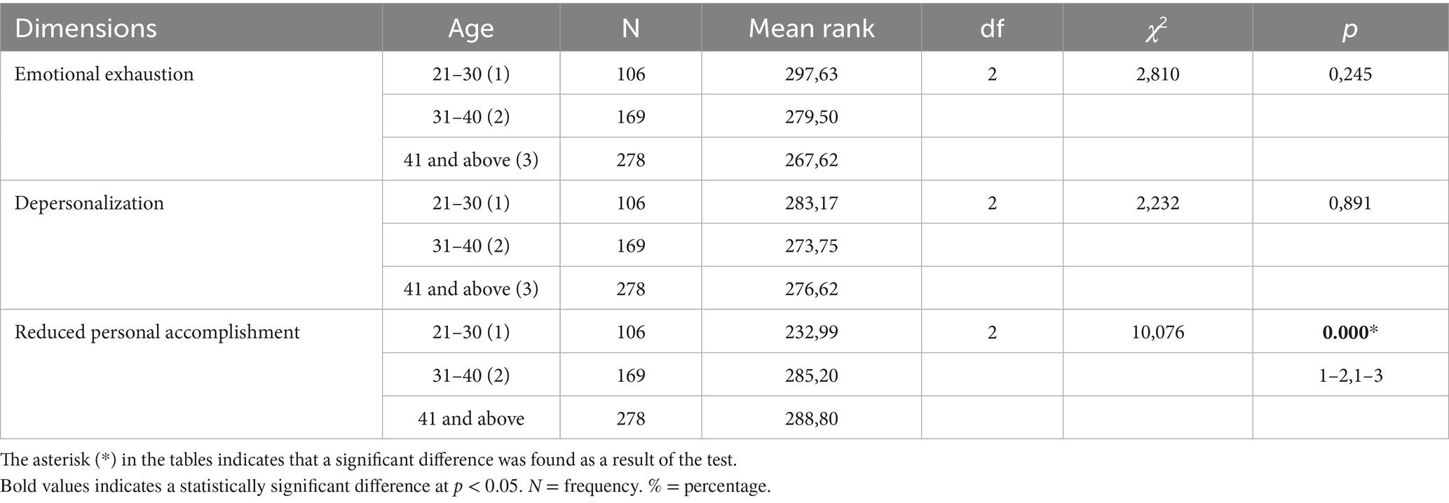 Table 9. Kruskal–Wallis H-test results on burnout score differences of participants’ age.