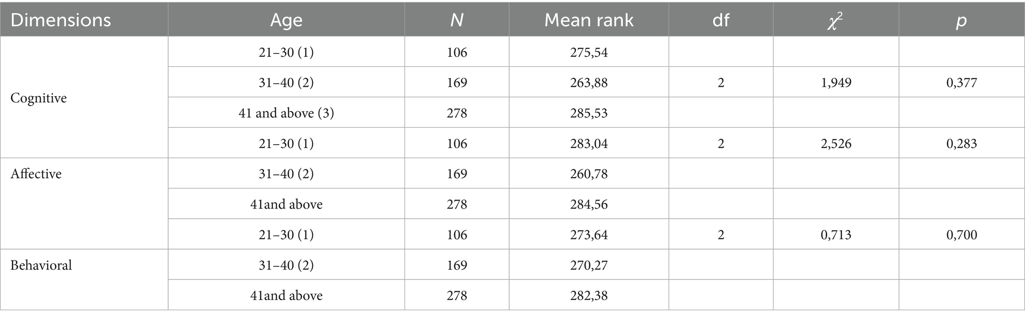 Table 10 presents the Kruskal–Wallis H test results comparing organizational cynicism scores by age. The results show no statistically significant differences across age groups in any of the dimensions, indicating that organizational cynicism levels are similar among teachers of different ages.