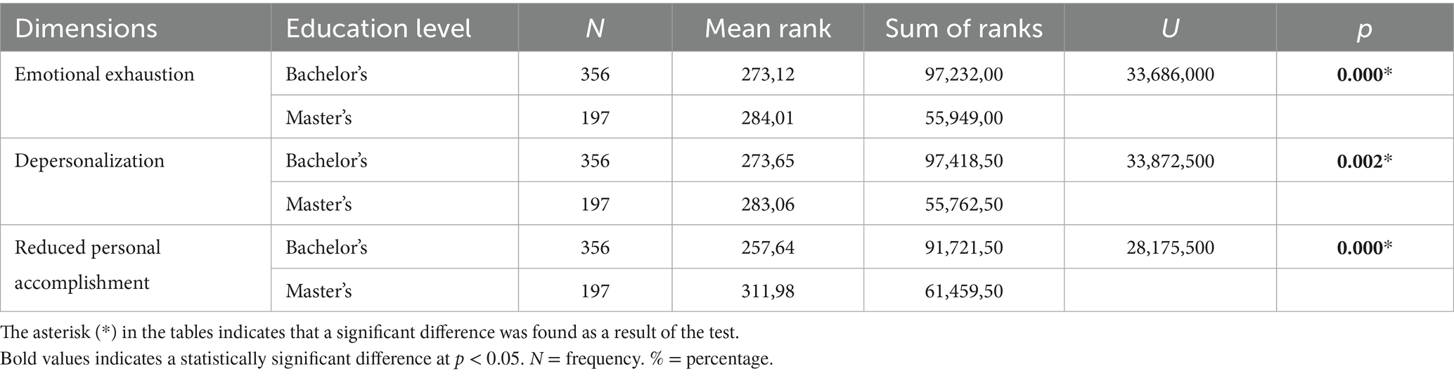Table 11. Mann–Whitney U-test results on burnout score differences of participants’ education level.