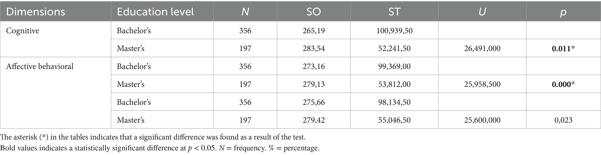 Table 12 presents the results of the Mann–Whitney U test conducted to assess whether the teachers had statistically (p < 0.05) significant differences regarding their education level in context of organizational cynicism levels. Teachers with Master’s degree had higher organizational cynicism levels in all the dimensions compared with teachers with Bachelor’s degree.