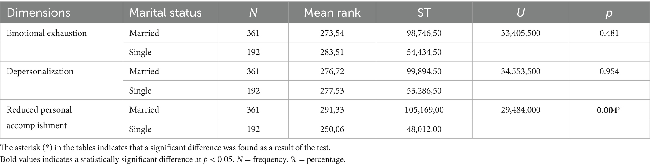 Based on the Mann–Whitney test results, participating teachers had statistically significant differences in (p < 0.05) the reduced personal accomplishment dimension. Results revealed that married teachers had higher burnout levels compared with single teachers.