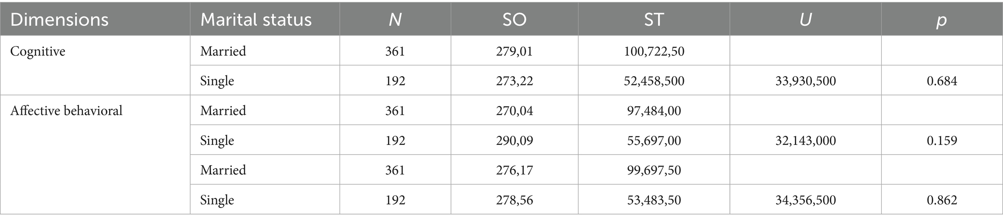 Table 13 presents the Mann–Whitney U test results examining differences in burnout scores by marital status. The analysis indicates that emotional exhaustion and depersonalization did not differ significantly between married and single teachers. However, a statistically significant difference was observed in reduced personal accomplishment, with married teachers exhibiting higher levels, suggesting marital status may influence this dimension of burnout.