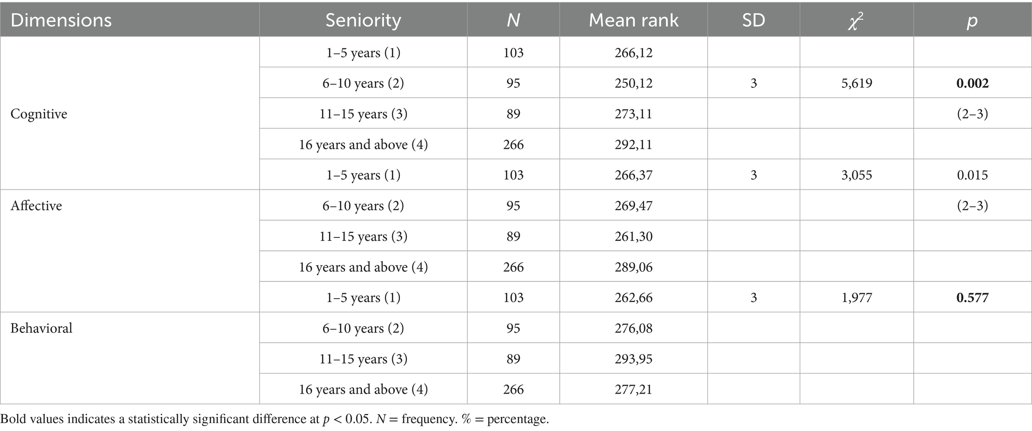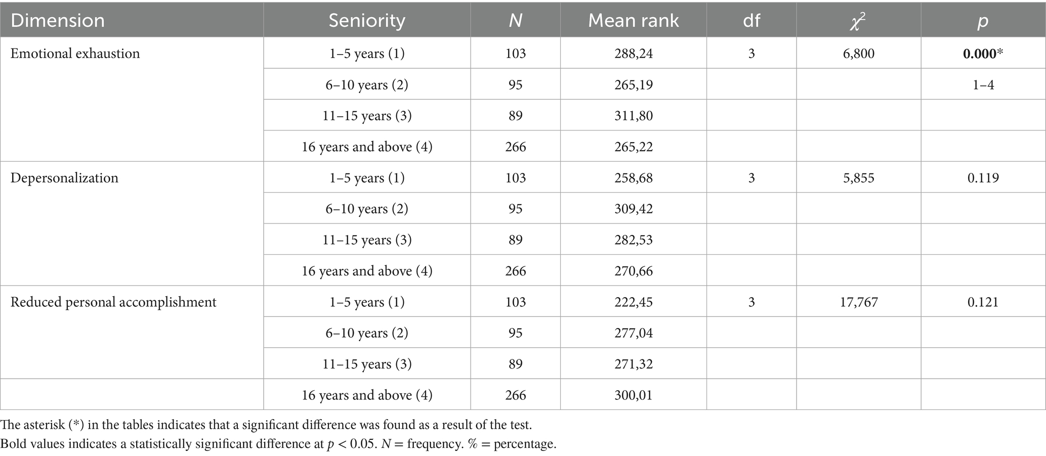 Kruskal-Wallis H test results revealed that participating teachers had statistically significant differences in the emotional exhaustion dimension regarding seniority. Therefore, Tamhane’s post-hoc test was conducted to examine the main variables regarding differences. Teachers with 1–5 years of work experience had statistically significant differences compared with teachers with a minimum of 16 years. Teachers with 1–5 years of work experience tended to experience intensive burnout in the emotional exhaustion dimension compared with those with a minimum of 16 years.