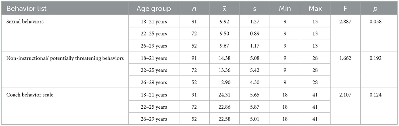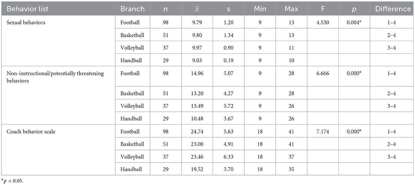 According to the findings, there were significant differences in the total and subscale scores of the Coach Behavior List based on the athletes' sports branch. Handball players reported lower scores in the subscales of sexual behaviors and non-instructional threatening behaviors, indicating less exposure to such conduct. This implies that coach-athlete interactions may differ in terms of cultural, structural, and communication dynamics depending on the type of team sport (Lang and Hartill, 2014). In more popular and competitive environments such as football, basketball, and volleyball, authoritarian coaching styles and gender-based power imbalances are reported to be more prevalent (Johansson et al., 2022). In this context, the higher scores of female football players compared to other branches may indicate a greater risk of abuse in such environments.