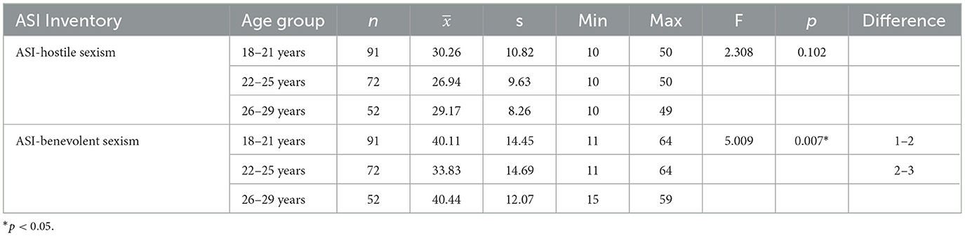 However, a statistically significant difference was found in the benevolent sexism subscale scores by age group (p < 0.05). Athletes aged 22–25 scored higher than those aged 18–21 and 26–29.