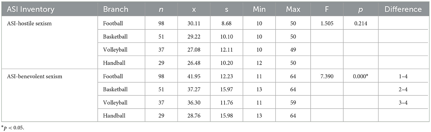 However, a statistically significant difference was found in benevolent sexism subscale scores by sport branch (p < 0.05). Female handball players scored lower on the benevolent sexism subscale compared to those in football, basketball, and volleyball.