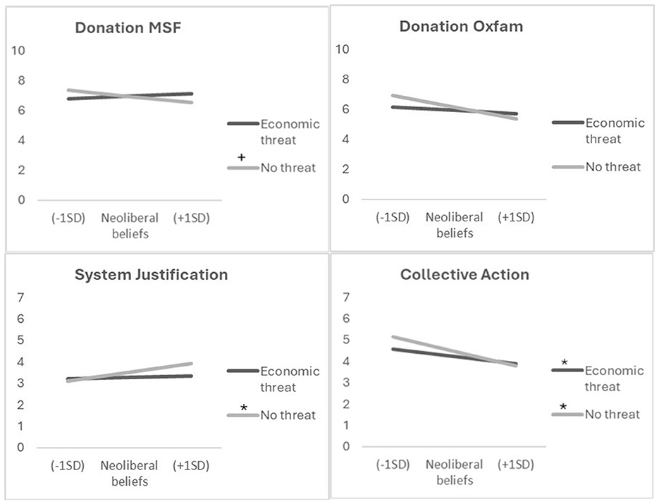 We found that neoliberal beliefs were associated with less prosociality and a lower willingness to change the system, supporting previous findings (Azevedo et al., 2019; Dutt and Kohfeldt, 2019; Ginn et al., 2022; Girerd and Bonnot, 2020; Girerd et al., 2020). However, when participants were confronted with an economic threat that violated shared values of equality and fairness for their ingroup, the negative effects of neoliberalism on prosociality were attenuated. Specifically, economic threat salience buffered the association between neoliberalism and both the willingness to donate to MSF and the justification of the current system as fair. Threat salience also weakened the negative relationship between neoliberalism and collective action, although it did not significantly influence the willingness to donate to Oxfam. In other words, people with high neoliberal beliefs differed less from people with low neoliberal beliefs in prosociality when an economic threat was salient.