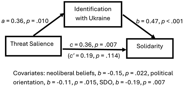 We expected threat salience to increase solidarity in line with the salient value of prosociality toward the Ukrainian outgroup through increased outgroup identification. Participants in the threat salient condition should show more willingness to help Ukrainians and protest against the war because they feel a stronger bond with the Ukrainian outgroup. To test this prediction, we conducted a mediation analysis with threat as the predictor (dummy-coded), identification with Ukrainians as the mediator, solidarity as the outcome, and neoliberal beliefs, social dominance orientation, and political orientation as covariates. The results showed a full mediation (see Figure 2). When the threat of the Ukrainian war was salient, participants identified more strongly with the outgroup of Ukrainians, which explained the increased solidarity, with an indirect effect of 95% CI [0.05, 0.32]. An exploratory moderated mediation analysis showed that threat salience effects on outgroup identification were not moderated by neoliberal beliefs (see Supplemental material).