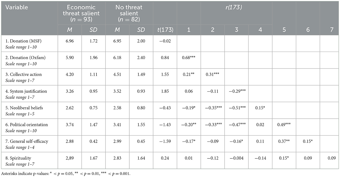 Table 1. Descriptives and correlations for neoliberal beliefs, prosociality, support for system change, system justification, political orientation, general self-efficacy, and spirituality, depending on economic threat salience in study 1.