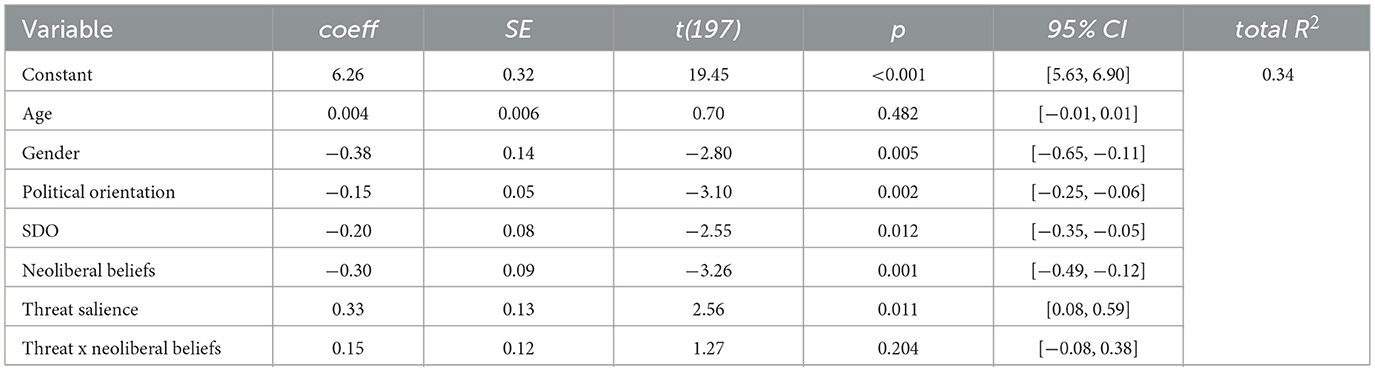 Running the same moderation analysis for system justification as dependent variable revealed a positive association with SDO, b = 0.26, SE = 0.08, t(197) = 3.38, p < 0.001, 95% CI [0.11, 0.41], but no relation with neoliberal beliefs, b = −0.07, SE = 0.09, t(197) = −0.74, p = 0.461, 95% CI [−0.25, 0.11] or political orientation, b = −0.04, SE = 0.05, t(197) = −0.87, p = 0.386, 95% CI [−0.14, 0.05]. There was no threat, b = −0.03, SE = 0.13, t(197) = −0.20, p = 0.844, 95% CI [−0.28, 0.23], nor threat x neoliberal beliefs interaction effect, b = 0.15, SE = 0.12, t(197) = 1.26, p = 0.208, 95% CI [−0.08, 0.38]. The model explained 9% of the variance.