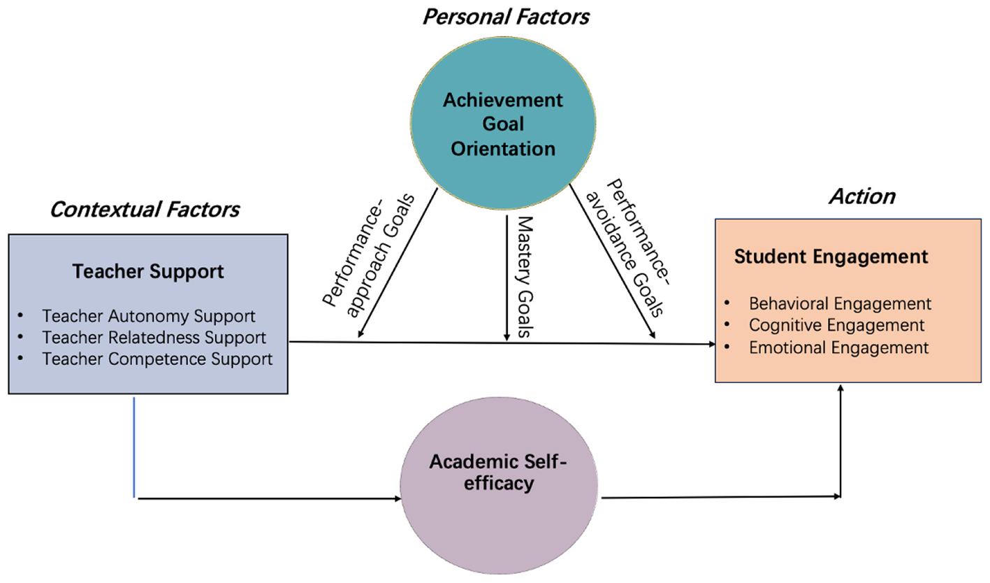 As outlined in the preceding sections, teacher support and personal motivational beliefs (academic self-efficacy and achievement goal orientation) are core variables for understanding students' learning engagement and learning process. These variables exist within a dynamic and interactive system. To unravel the intrinsic relationships and pathways of influence among them, this study integrates these theories to provide a comprehensive explanatory model.