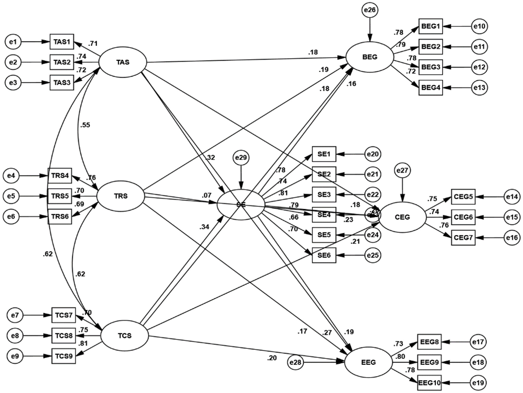 As shown in Table 7, the confidence intervals for the mediation paths TAS = >BEG (0.012 ~ 0.106), TAS = >CEG (0.023 ~ 0.127), TAS = >EEG (0.021 ~ 0.125), TCS = >BEG (0.011 ~ 0.117), TCS = >CEG (0.023~ 0.133), TCS = >EEG (0.021 ~ 0.130) do not include 0, indicating that SE as a mediator in the relationship between both teacher autonomy support and student engagement, as well as teacher competence support and student engagement. Although the indirect effects are modest in size (e.g., standardized β = 0.051 for TAS = > SE = > BEG), their effect size analyses across the three dimensions consistently demonstrate statistical significance. This provides empirical justification for testing mediation not only at the overall construct level but also at the dimension level. In particular, the findings confirm that academic self-efficacy contributes simultaneously to students' behavioural, cognitive, and emotional engagement, though the strength of effects varies slightly across dimensions. This dimension-level effect size analysis highlights that self-efficacy may be more strongly linked to cognitive and emotional engagement than to behavioural participation, thereby offering a more detailed understanding of the motivational pathway.