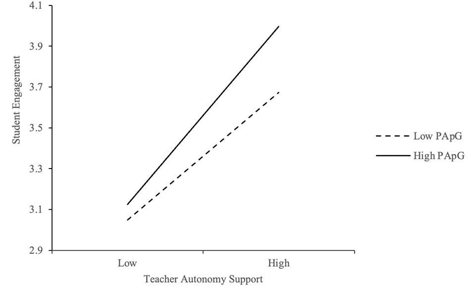 To examine whether performance-approach goal orientation (PApG) moderates the relationship between teacher support and student engagement, interaction terms were tested. As shown in Table 9, the interactions between teacher autonomy support (TAS) and PApG (B = 0.108, p < 0.01), and between teacher competence support (TCS) and PApG (B = 0.097, p < 0.05) were both statistically significant, indicating positive moderation effects. Figures 4, 5 illustrate the interaction effects, with simple slopes plotted at high and low levels of PApG (±1 SD from the mean). The plots reveal that the positive relationships between TAS and engagement, and between TCS and engagement, were stronger among students with higher levels of performance-approach orientation. These students, motivated to demonstrate their competence, appear to benefit more from autonomy- and competence-supportive teaching practices. The effect sizes of these interactions (β = 0.108 for TAS × PApG; β = 0.097 for TCS × PApG) indicate small-to-moderate moderation effects, which are statistically meaningful in the educational context.
