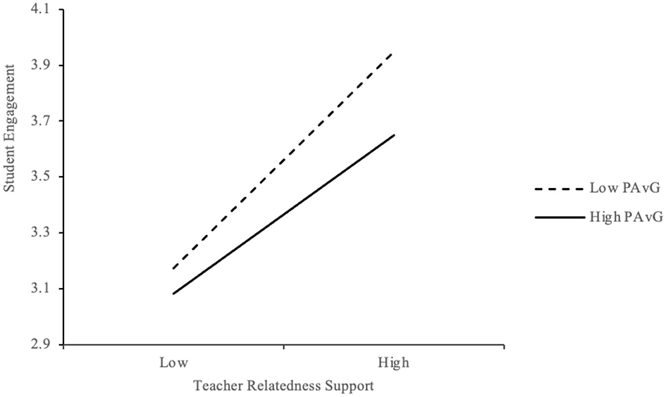 To examine the moderating role of performance-avoidance goal orientation (PAvG), interaction terms were tested. As shown in Table 10, the interaction between teacher relatedness support (TRS) and PAvG was significant (B = −0.092, p < 0.05), indicating a negative moderating effect. Figure 6 illustrates that the positive relationship between TRS and student engagement was weaker among students with higher PAvG. These students, motivated by fear of failure or negative evaluation, may be less receptive to emotional support, thereby limiting its impact on engagement.