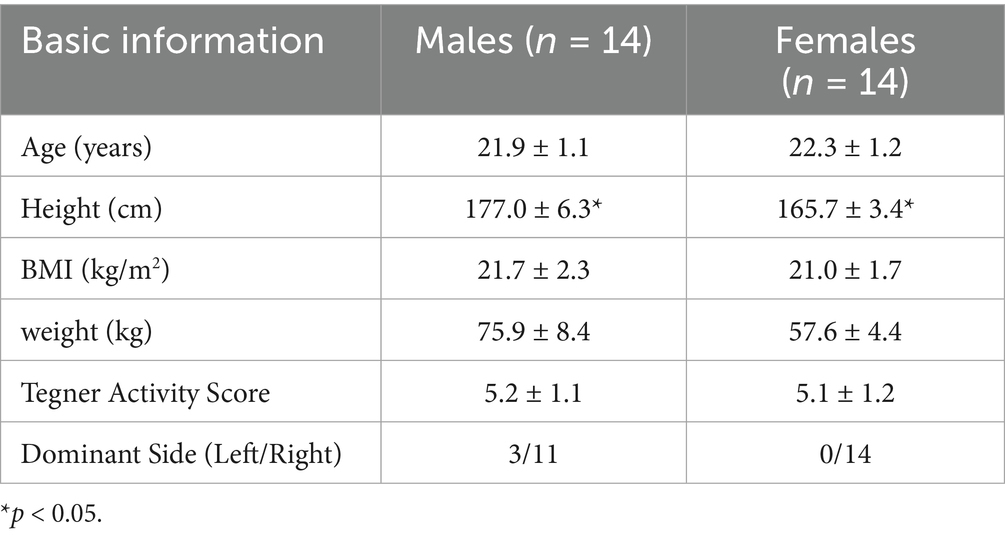 Using G*Power 3.1.9 software, with reference to previous studies and the statistical methods employed herein (Ma et al., 2025; Romagnoli et al., 2024), the required sample size was estimated. Power (1-β), type I error (α), and effect size (f) were set to 0.80, 0.05, and 0.40, respectively, yielding a minimum sample size of 16 participants. Ultimately, twenty-eight healthy sport science university students (14 males, 14 females) were recruited. The male group included 5 students specializing in basketball, 4 in volleyball, 3 in badminton, and 2 in tennis. The female group had an identical composition. The dominant leg was determined using the kick-ball test (Ren et al., 2021). All assessments and screenings were conducted by an experienced experimenter. Prior to the experiment, all participants were informed of the testing procedures and provided written informed consent. The study was approved by the Ethics Committee of Soochow University (Ethics Approval No.: SUDA20250425H04). Participant Characteristics are presented in Table 1.