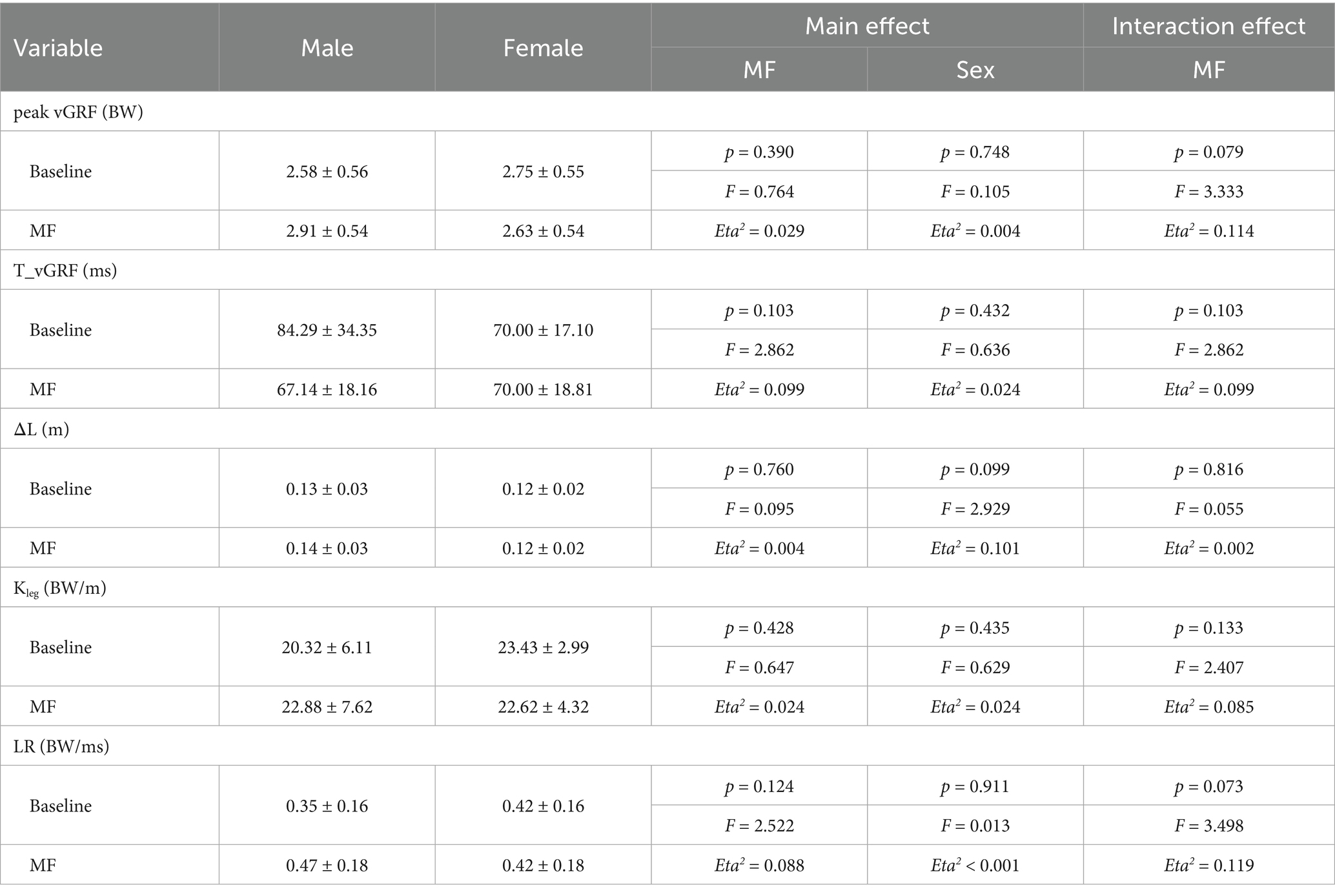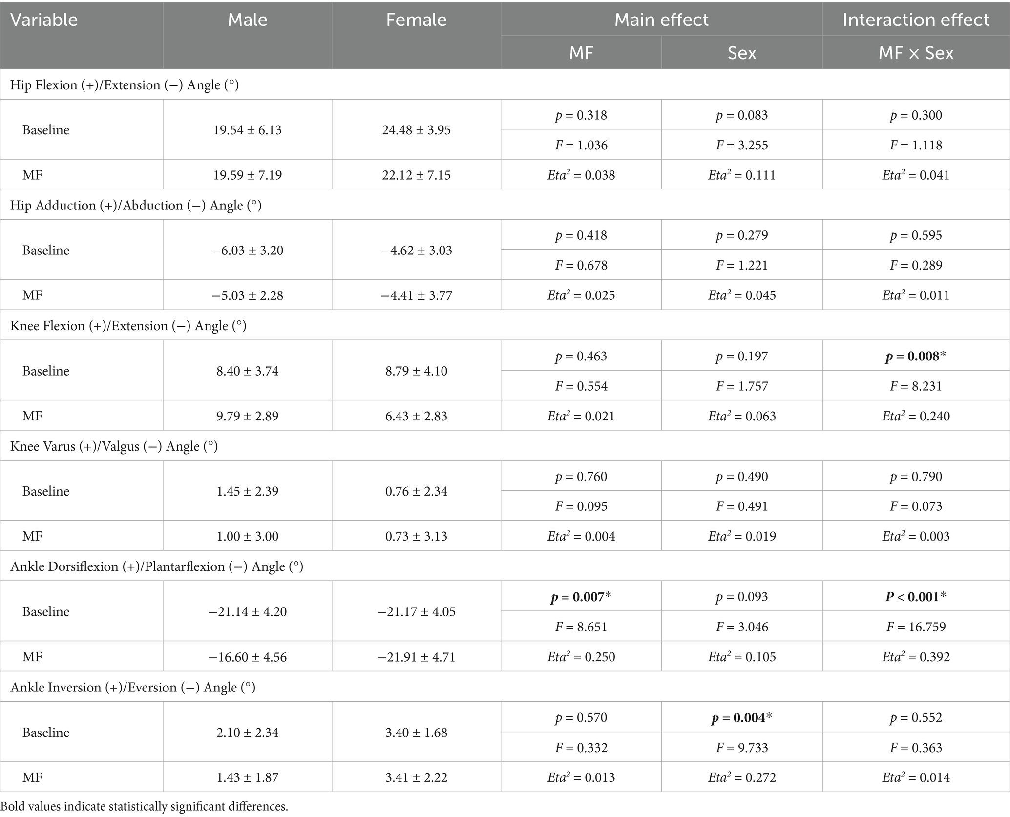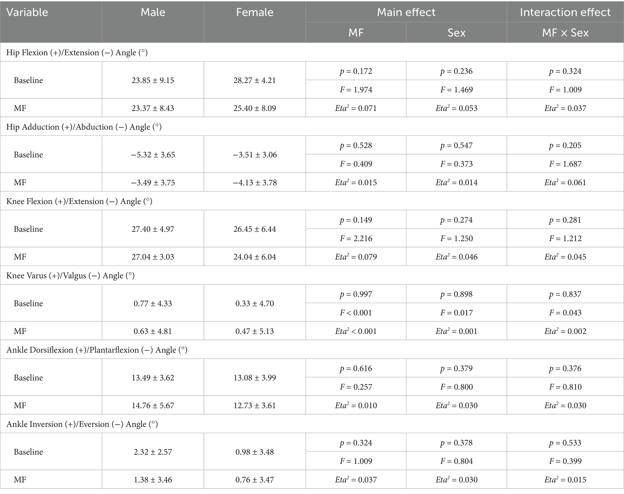 Data were analyzed using SPSS 27.0 software. Descriptive statistics are presented as mean ± standard deviation (M ± SD). The Shapiro–Wilk test assessed normality, and Levene’s test assessed homogeneity of variance. A 2 (Sex: Male, Female) × 2 (Condition: MF, Baseline) mixed-design repeated-measures ANOVA was used to analyze kinematic and kinetic data. Statistical significance was set at α = 0.05. Upon significant interaction effects, simple effects analysis was performed, with the significance level adjusted to p < 0.0125 to account for four primary comparisons.