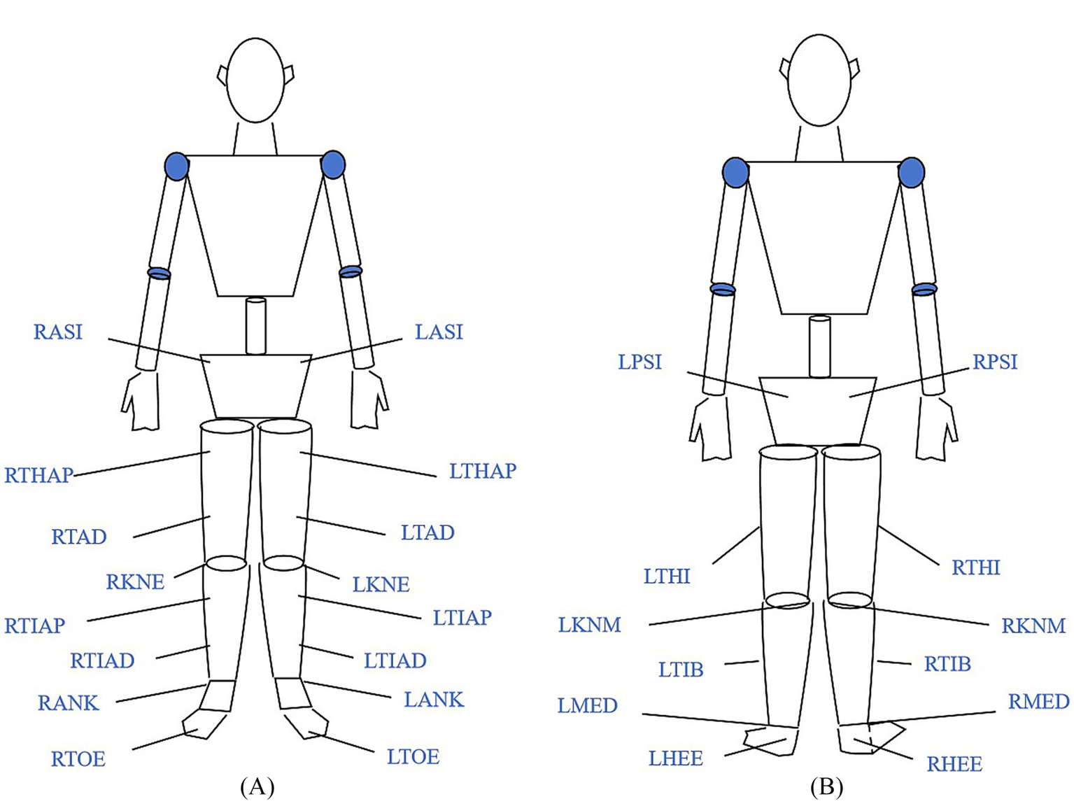 Marker point pasting (A) Front view; (B) Back view. Adapted from Wang et al. (2024b). LANK: Left lateral malleolus; LASI: Left anterior superior iliac spine; LHEE: Left heel; LKNM: Left medial knee; LKNE: Left lateral knee; LMED: Left medial malleolus; LPSI: Left posterior superior iliac spine; LTHAP: Left thigh proximal; LTHI: Left thigh; LTAD: Left thigh distal; LTIB: Left tibia; LTIAD: Left tibia distal; LTIAP: Left tibia proximal; LTOE: Left toe; RANK: Right lateral malleolus; RASI: Right anterior superior iliac spine; RHEE: Right heel; RKNM: Right medial knee; RKNE: Right lateral knee; RMED: Right medial malleolus; RPSI: Right posterior superior iliac spine; RTHAP: Right thigh proximal; RTHI: Right thigh; RTAD: Right thigh distal; RTIB: Right tibia; RTIAD: Right tibia distal; RTIAP: Right tibia proximal; RTOE: Right toe.