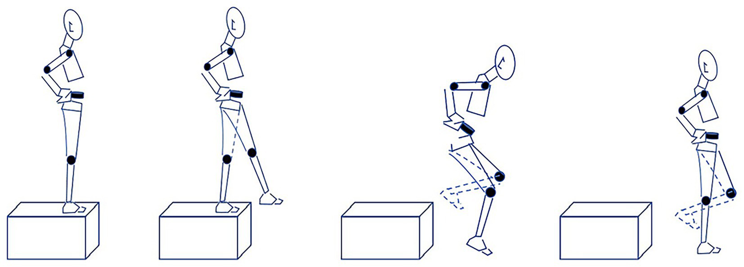 The single-leg drop landing test was designed based on previous studies by Meng et al. (2022) and Wang et al. (2024b). Participants stood naturally on a 30 cm high box with feet shoulder-width apart. During testing, hands were placed on the hips to avoid inertial effects from arm swing. Participants were instructed to perform a single-leg landing onto the force plates using a “toe-heel” landing pattern (Figure 2). Prior to formal testing, all participants were given sufficient practice trials to familiarize themselves with and master the landing maneuver. To reduce random error and enhance data reliability, participants performed three successful trials for their dominant leg both pre- and post-MF. The average of the three trials was used for analysis.