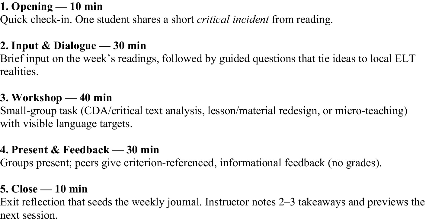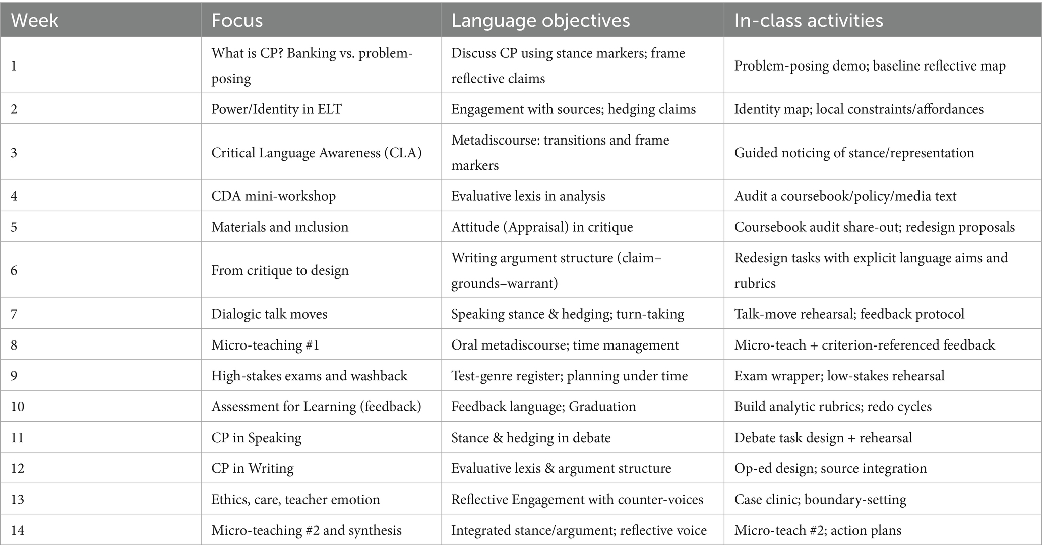 Operationally, the course followed a stable sequence: brief input and guided dialogue, followed by small-group CLA/CDA workshops, presentations with criterion-referenced peer feedback, and exit reflections (Figure 1). Within this sequence, these practices were implemented (1) news critical-literacy workshops using SFL-informed projection analysis; (2) coursebook focusing on stance, voice, and representation, followed by redesign of tasks with explicit language objectives; (3) micro-teaching of the redesigned tasks to rehearse pedagogy; and (4) reflective journals and debrief interviews to trace cognitive/affective shifts in participation and perspective-taking. This sequencing is consistent with published CLA/CDA classroom models and recent “CDA-as-pedagogy” accounts (Huang and Guo, 2024; Chen et al., 2024; Askari and Behdarvandirad, 2025). In practical terms, CLA/CDA anchored Weeks 3–4 and 7–9 (text-analysis and redesign cycles) and recurred in Weeks 10–12 via micro-teaching and peer feedback, while dialogic routines ran every week to stabilize participation and safety norms (see course flow/weekly plan).