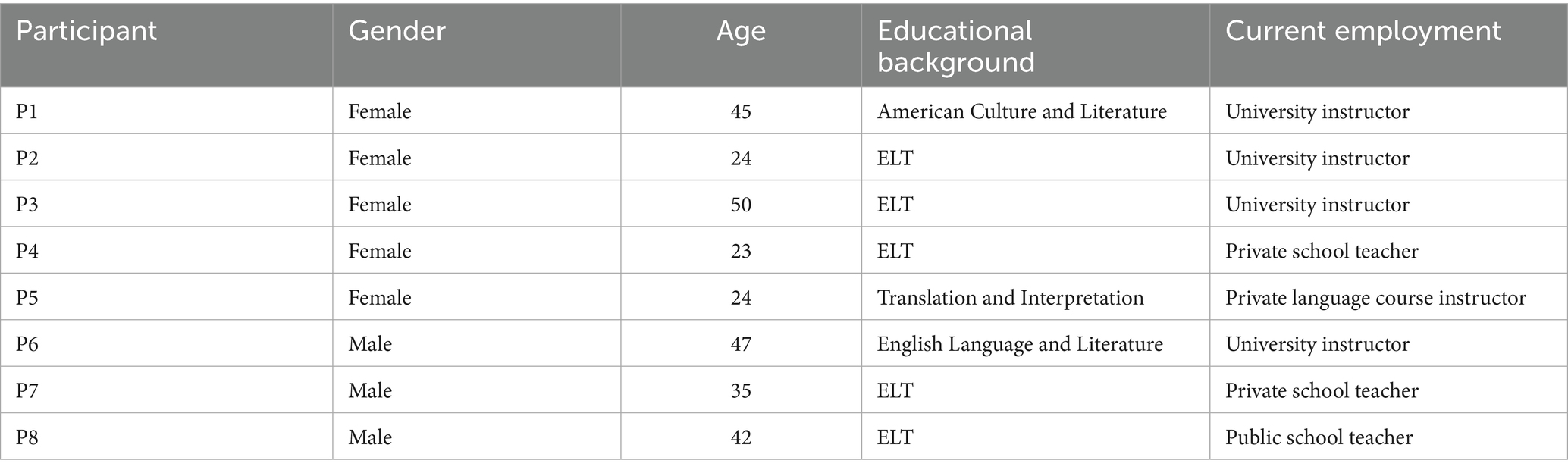 The participants were eight ELT master’s degree students out of 15 enrolled in CP course. A purposive sampling was utilized to recruit participants as the study involved investigating the participants’ reflective and transformative experiences in working with coursework focused on CP. All students were informed about the research project in the first 2 weeks of the semester and all participation was voluntary. Students who were willing to participate in the research were invited to sign informed consent forms. No exclusion criteria was applied except for the course enrollment. These eight participants who volunteered submitted ongoing weekly reflections and agreed to participate in follow-up interviews. This self-selection process aligns with ethical research in qualitative research, especially in research that could involve sensitive issues like pedagogical beliefs, discomfort, or potential ideological resistance (Creswell and Poth, 2018; Merriam and Tisdell, 2016).