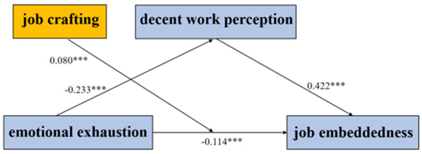 The results of the means, standard deviations, and correlation coefficients of the variables of this study are shown in Table 2. The mean score of nurses’ emotional exhaustion was 31.15 ± 11.47, the mean score of decent work perception was 53.40 ± 10.44, the mean score of job embeddedness was 24.06 ± 4.99, and the mean score of job crafting was 72.06 ± 13.75. The Pearson correlation analysis revealed that emotional exhaustion was negatively correlated with the decent work perception (r = −0.455, p < 0.001), job embeddedness (r = −0.437, p < 0.001), and job crafting (r = −0.302, p < 0.001). The decent work perception was positively correlated with job embeddedness (r = 0.535, p < 0.001) and job crafting (r = 0.363, p < 0.001). Moreover, job crafting was positively correlated with job embeddedness (r = 0.345, p < 0.001).