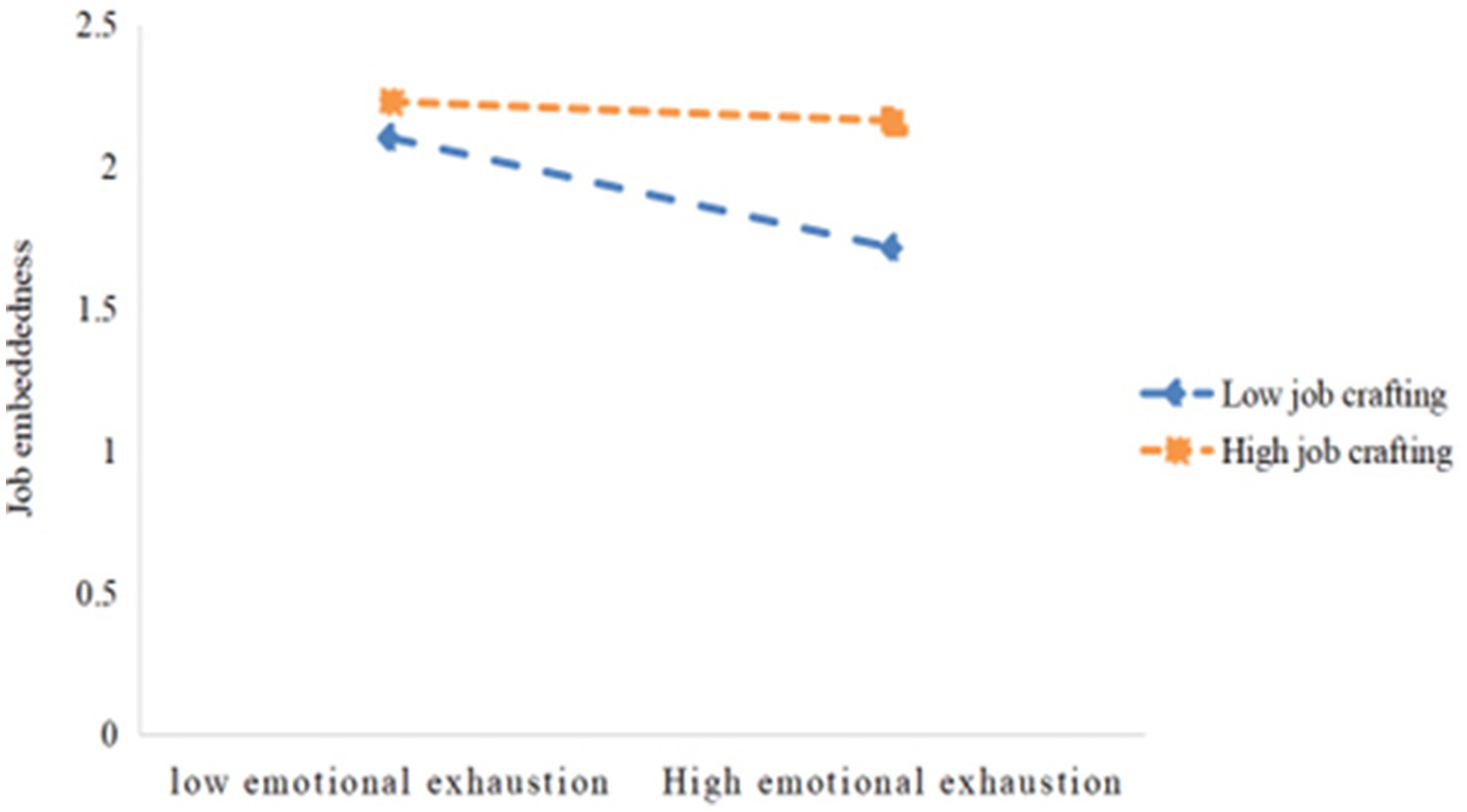 Table 6. Conditional effects of emotional exhaustion on job embeddedness at different levels of job crafting.
