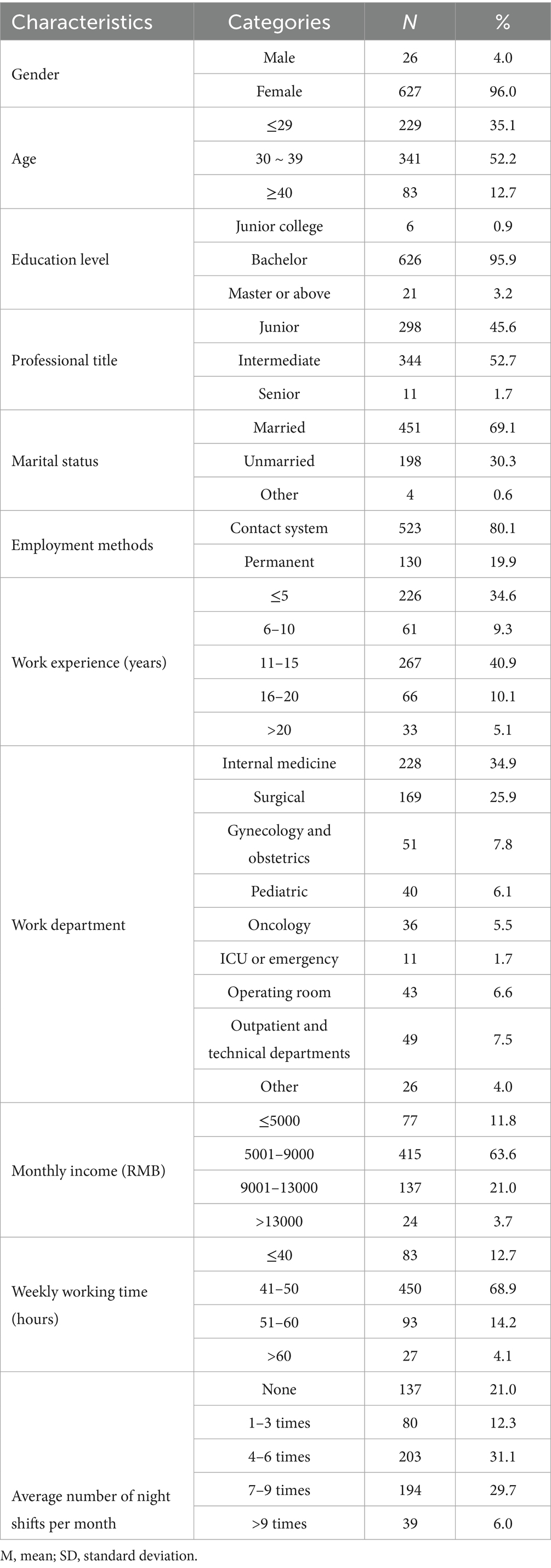 From February to March 2025, nurses from three general hospitals in Shanxi Province, China, were selected for the survey using a convenience sampling method. The inclusion criteria for participants were as follows: (1) registered nurses with a nursing license; and (2) informed consent and willingness to participate in the study. Exclusion criteria included (1) nurses who were on vacation during the survey period; (2) internship nurses; and (3) nurses in advanced training. According to Kendall’s principle of sample size estimation, the sample size is 10–20 times the number of independent variables (Fang et al., 2025). This study contains 21 independent variables, so the required sample size is 21 × (10–20) = (210–420). Considering 20% invalid questionnaires, a sample size of 263 to 525 nurses was required. A total of 672 questionnaires were finally returned, of which 653 were valid, giving an effective return rate of 97.2%.