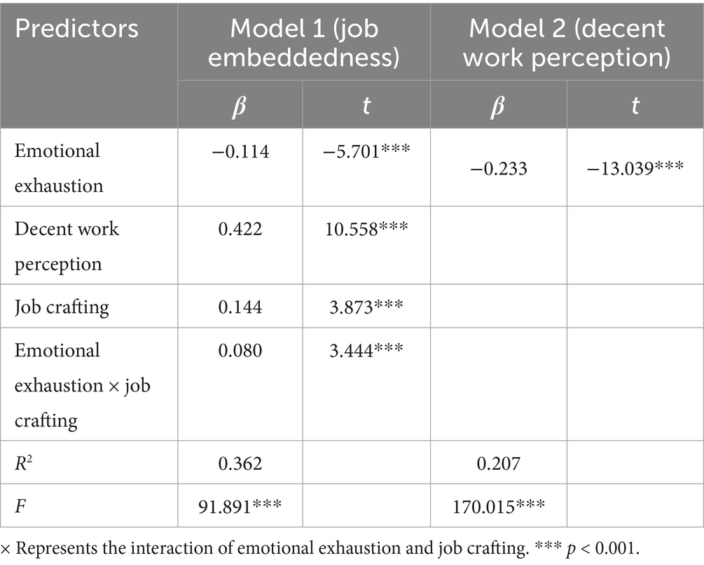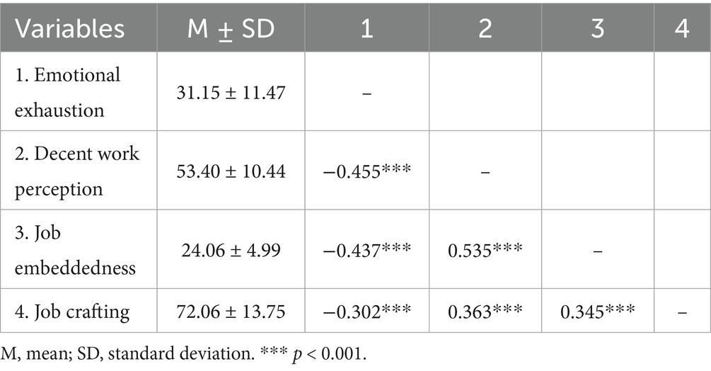 Results: There was a significant negative correlation between nurses’ emotional exhaustion and job embeddedness (p < 0.001). Decent work perception played a partial mediating role between emotional exhaustion and job embeddedness, accounting for 44.1% of the total effect. In addition, job crafting positively moderated the effect of emotional exhaustion on job embeddedness.
