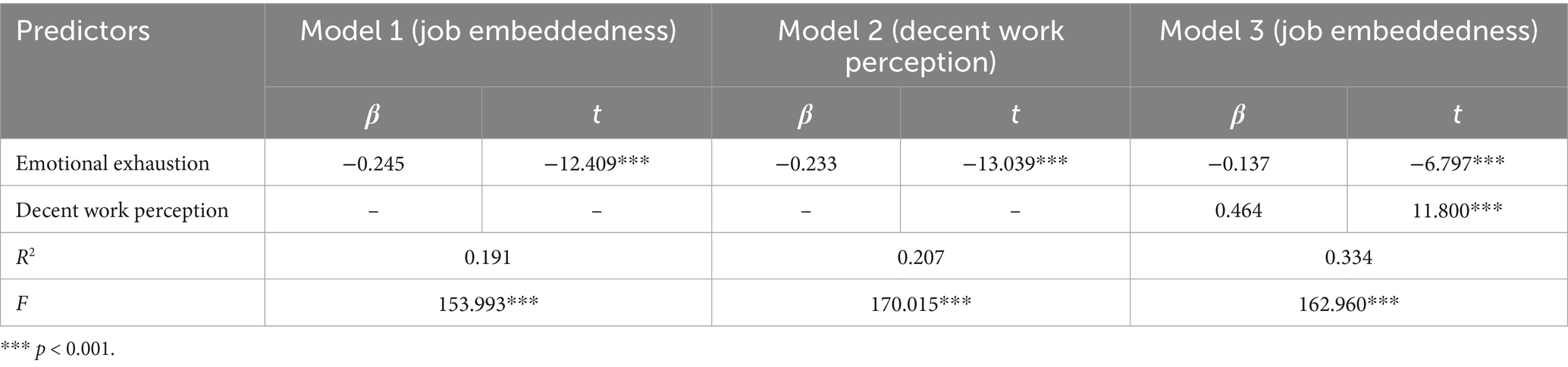 To elucidate the mechanism through which emotional exhaustion impairs job embeddedness, this study introduces decent work perception as a potential mediator. The concept of “decent work,” pioneered by the International Labor Organization, referring to the principle that all workers can have decent and dignified work on the basis of equality, freedom, safety and dignity, with the core elements of guaranteeing the individual’s employment rights, employment equity, social security and social dialogue (Xue et al., 2025). At the individual level, the decent work perception refers to an individual’s subjective perception regarding the value and dignity of their work, which is mainly reflected in the degree of recognition of the job position, work atmosphere and career development, job rewards, and professional recognition (Othman et al., 2025). Due to the nature of their profession, nursing staff are gradually encountering unseemly and unfair situations at work, and the physical, psychological and social risks they face are also constantly increasing (Zheng et al., 2025; Zhong et al., 2024). We propose that emotional exhaustion is a key driver that erodes nurses’ decent work perception. Empirically, research has indicated a negative correlation between job burnout and decent work perception among nurses (Zhang et al., 2024b). Theoretically, this relationship can be understood through the lens of Affective Events Theory (AET). The AET posits that specific work events can trigger emotional responses in individuals, and these responses in turn shape their attitudes towards and cognitive evaluations of the work environment, thereby influencing subsequent behavioral responses (Tu et al., 2025). In the AET framework, emotional exhaustion can be regarded as a persistent negative emotional state triggered by recurring work-related events. The accumulation of this state may diminish individuals’ sense of identity and value derived from their profession, negatively impacting their perception of decent work (Yang et al., 2025). Therefore, we propose the following hypothesis: