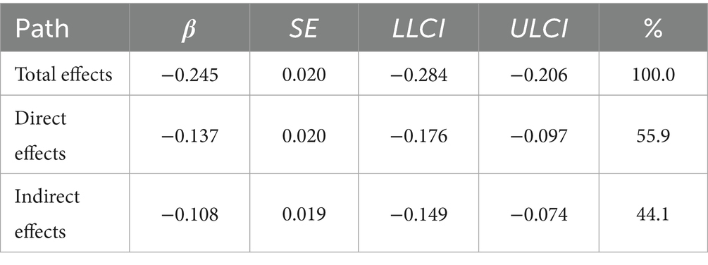 To assess the mediating effect of nurses’ decent work perception between emotional exhaustion and job embeddedness, Model 4 in PROCESS was utilized. The results showed that emotional exhaustion had a significant negative effect on decent work perception (β = −0.233, t = −13.039) and job embeddedness (β = −0.245, t = −12.409). After using decent work perception as a mediating variable, the direct effect of emotional exhaustion on job embeddedness remained significant (β = −0.137, t = −6.797), and decent work perception was significantly positively correlated with job embeddedness (β = 0.464, t = 11.800) (Table 3). Bootstrap analyses showed that emotional exhaustion indirectly affects job embeddedness through the decent work perception, with a 95%CI that did not contain 0 (indirect effect = −0.108, 95%CI = (−0.149, −0.074)), indicating a statistically significant mediating effect. Furthermore, the mediating effect accounted for 44.1% of the total effect (Table 4).