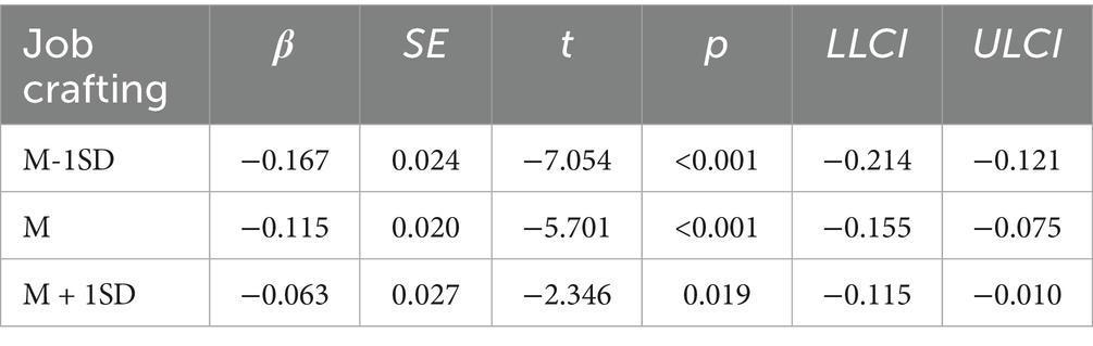 To better account for this moderating effect, we conducted a simple slope analysis to categorize participants into low and high job crafting groups based on standard deviations below or above the mean. As shown in Figure 2 and Table 6, at lower levels of job crafting, emotional exhaustion was negatively associated with job embeddedness (β = −0.167, p < 0.001). However, at higher levels of job crafting, emotional exhaustion showed a weaker negative association with job embeddedness (β = −0.063, p = 0.019). These results suggest that the negative correlation between emotional exhaustion and job embeddedness becomes weaker with increasing job crafting, namely, job crafting plays a positive moderating role between emotional exhaustion and job embeddedness.