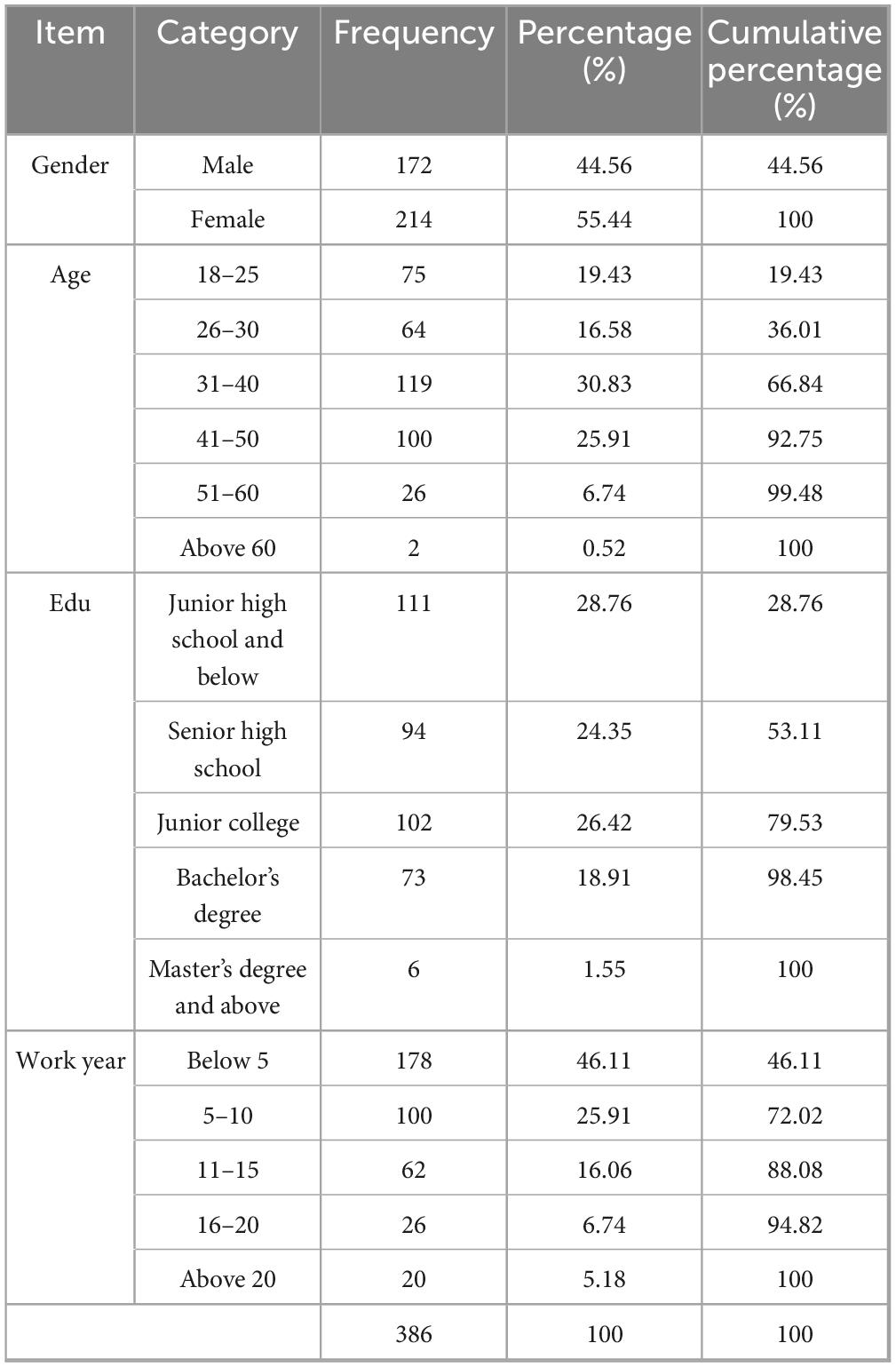 To better understand the demographic characteristics of the respondents, this study conducted a frequency analysis of 386 valid questionnaires, focusing on gender, age, education level, and years of work experience. The results are as follows: