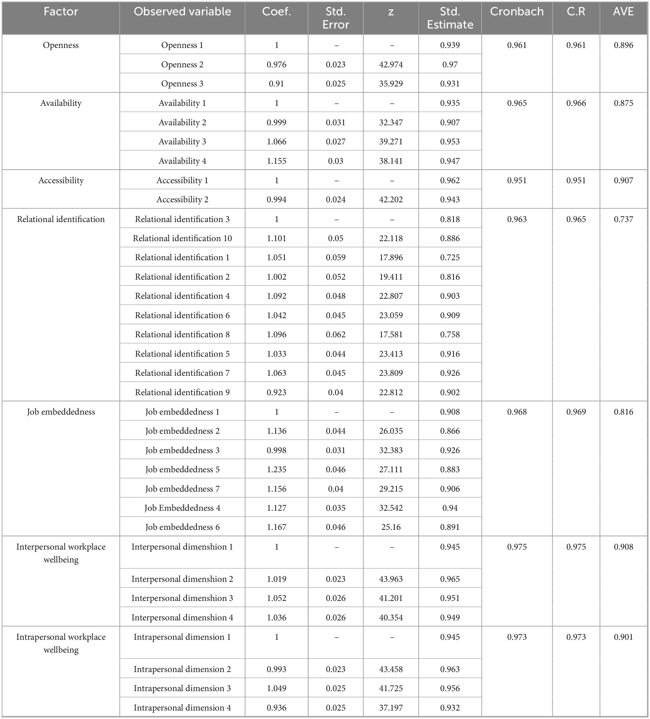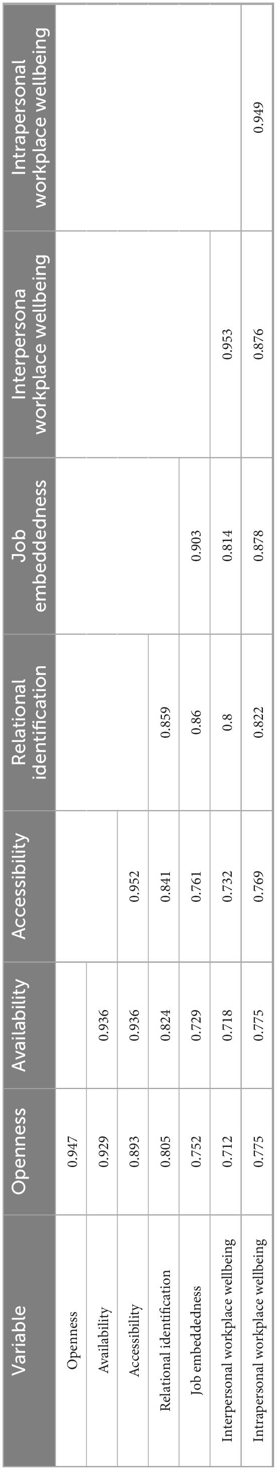 Relational Identification (α = 0.963), Job Embeddedness (α = 0.968), and Workplace Well-being (Interpersonal α = 0.975; Intrapersonal α = 0.973) also demonstrated excellent internal consistency;