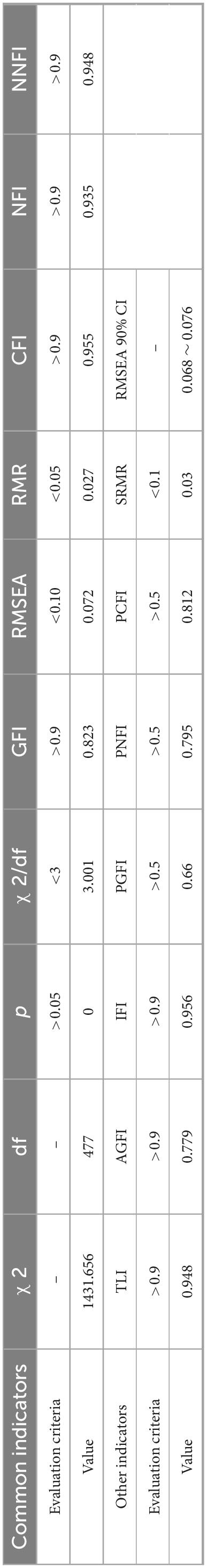 The chi-square statistic was χ2 = 1431.656 with 477 degrees of freedom, yielding a χ2/df = 3.001. Although slightly above the ideal threshold of 3, this value is still considered acceptable given the relatively large sample size (N = 386), as chi-square is sensitive to sample size (Bollen, 1989);