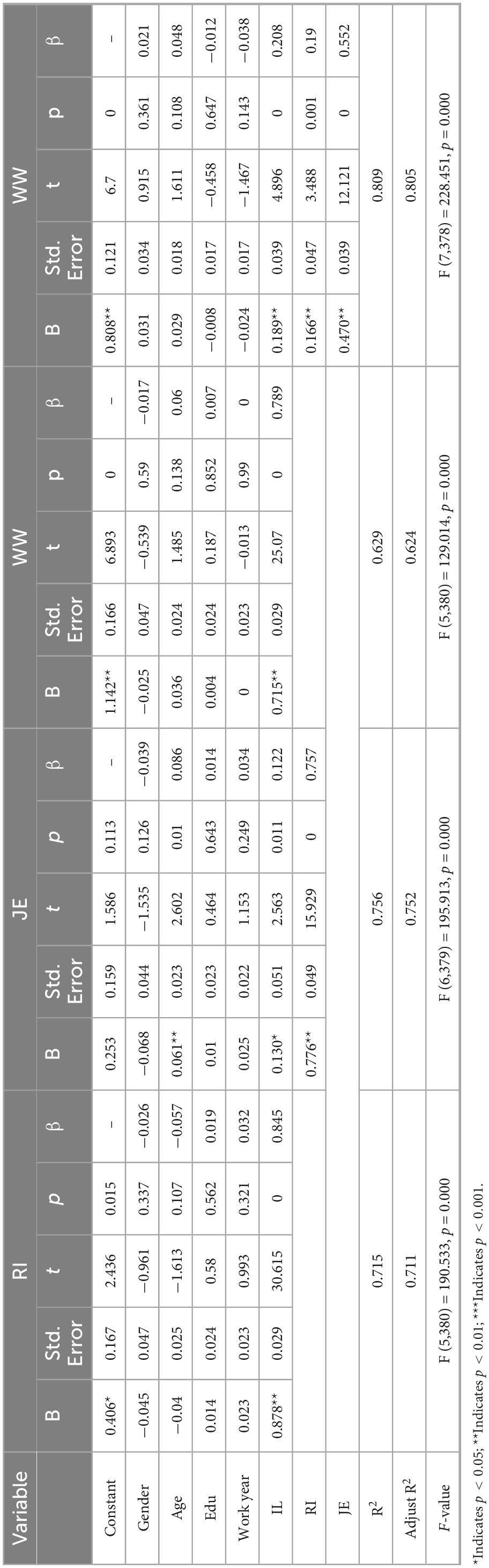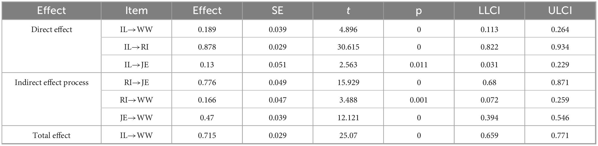 Second, job embeddedness has a significant positive impact on employees’ workplace wellbeing. Employees with high levels of job embeddedness often experience a stronger sense of emotional belonging, tighter social networks, and greater role stability-factors that help reduce job uncertainty and turnover anxiety, while enhancing emotional stability and wellbeing (Ampofo and Karatepe, 2022). Studies have shown that when employees possess more social links, cognitive fit, and perceived costs of leaving the organization, they are more likely to derive satisfaction, security, and a sense of meaning from their work, thereby reporting higher levels of subjective workplace wellbeing (Ahmad et al., 2023). In addition, job embeddedness can also boost intrinsic motivation, enabling employees to experience sustained emotional positivity through active engagement at work (Ramaite et al., 2022).