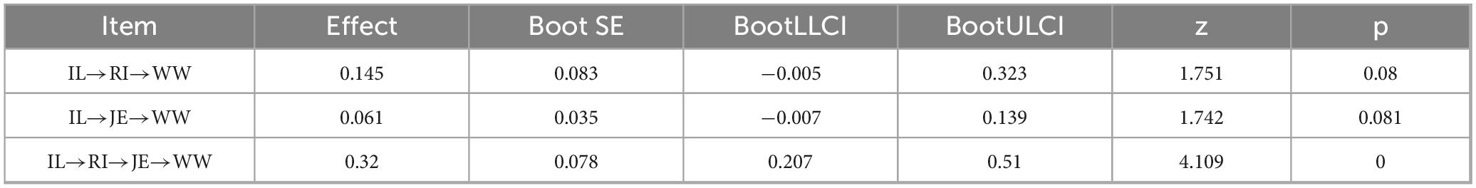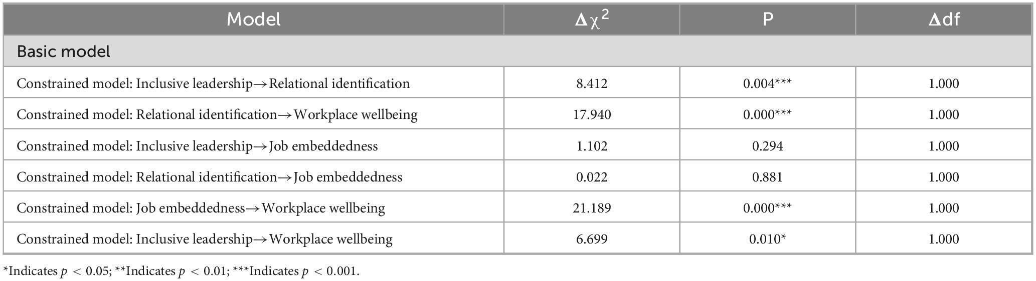 Finally, employees who are embedded in both emotional identification and organizational connection are more likely to perceive satisfaction, achievement, and fulfillment from their work-manifesting as higher levels of workplace wellbeing (Karanika-Murray et al., 2015). Therefore, SIT not only reveals the potential link between inclusive leadership and employee wellbeing, but also provides strong theoretical support for the construction of a chain-mediating pathway through relational identification and job embeddedness.