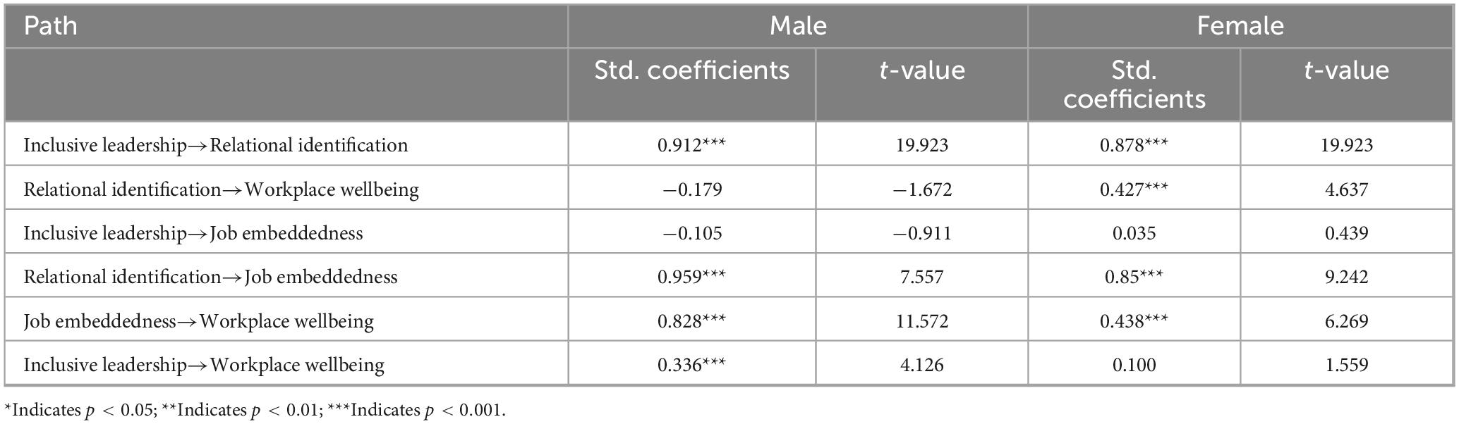 Implement gender-sensitive management by recognizing differential psychological responses. Multi-group SEM results indicate that male employees are more likely to convert relational identification into strong embeddedness, which contributes to higher levels of wellbeing. Female employees, by contrast, exhibit greater sensitivity to relational cues, deriving wellbeing more directly from relational satisfaction. These differences call for tailored management strategies: for female employees, organizations might focus on emotional incentives and frequent interpersonal feedback; for male employees, emphasis could be placed on structured career development paths and role stability to support sustained embeddedness (Akkan and Guzman, 2022; Choi et al., 2017; Hu et al., 2025).