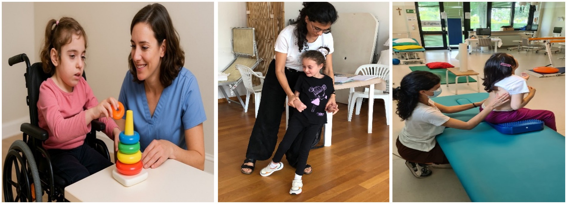 Figure 1. Examples of rehabilitation activities conducted during the intervention. The images show a child with Rett syndrome supported by therapists and educators while performing different tasks: a fine motor exercise involving stacking colored rings, assisted walking for gross motor training, and postural control activity on a therapy table.