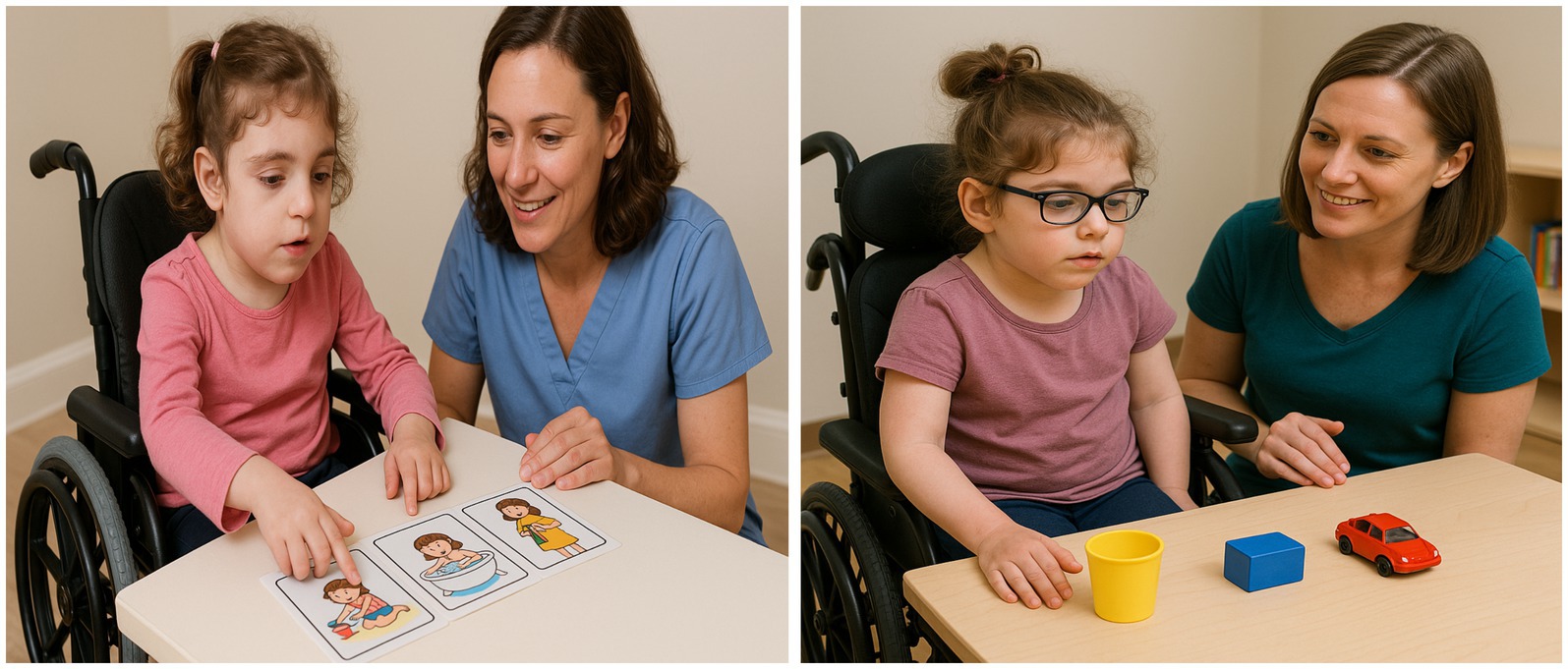 Figure 2. Examples of neuropsychological tasks carried out during the intervention. The images show two girls with Rett syndrome engaged in different activities with a therapist: in the first, the child is identifying the correct temporal sequence of a short, illustrated story; in the second, the child is involved in a memory task using simple objects placed on the table.