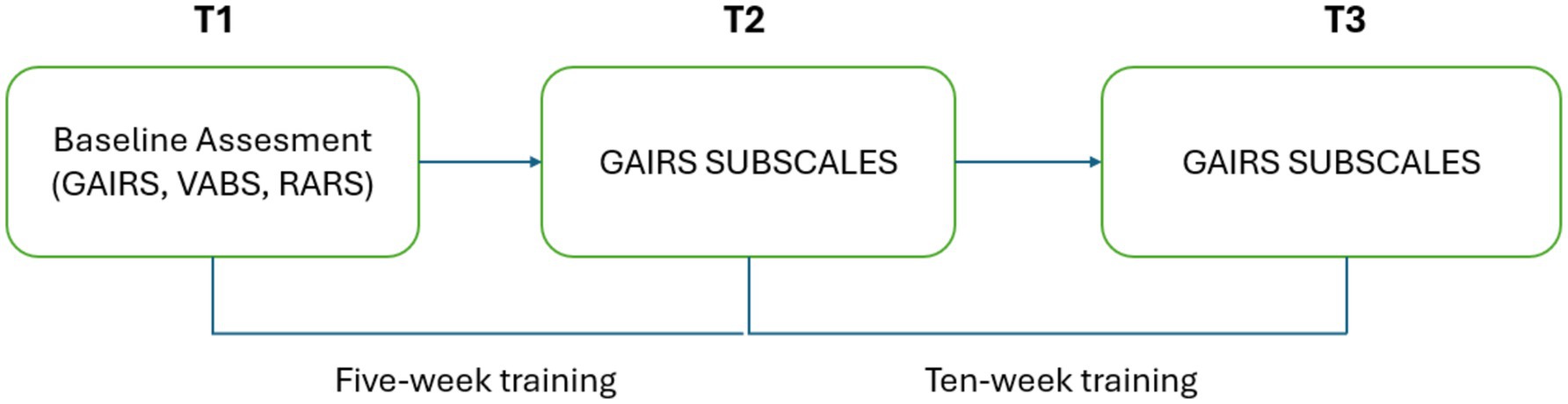 Flowchart showing a three-stage process labeled T1, T2, and T3. T1 involves a baseline assessment including GAIRS, VABS, and RARS. T2 and T3 involve GAIRS subscales. Arrows indicate progression from T1 to T2 and T2 to T3. Below, five-week and ten-week training durations are specified.