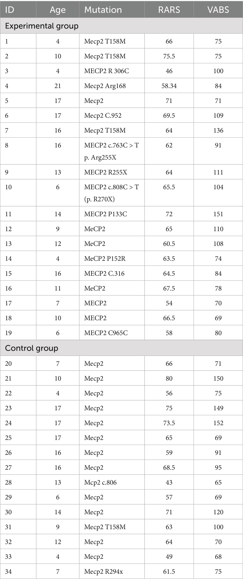 The standardized tools used during baseline assessment included the Rett Assessment Rating Scale (RARS) Fabio et al. (2025b) to evaluate syndrome severity and the Vineland Adaptive Behavior Scales (VABSs) (Sparrow et al., 2016) to assess adaptive functioning.