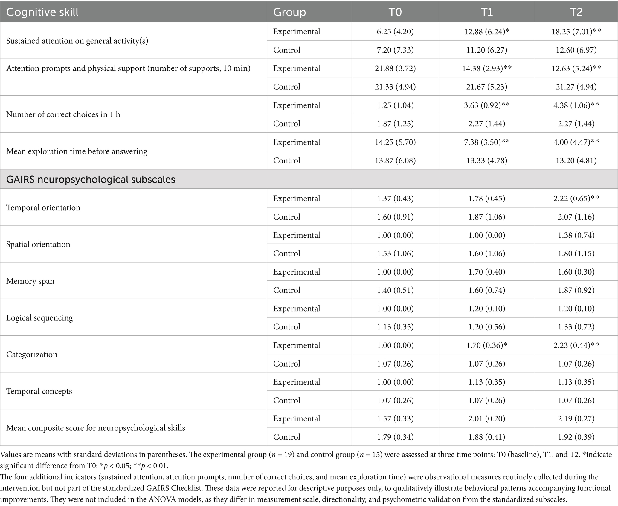 Overall, the mean composite score for neuropsychological skills increased from 1.57 (SD = 0.33) at T0 to 2.19 (SD = 0.27) at T2 in the experimental group, reflecting global cognitive improvement. In contrast, the control group showed only marginal gains. These patterns support H1 and are consistent with H3, which anticipated cumulative improvements after the second treatment cycle.