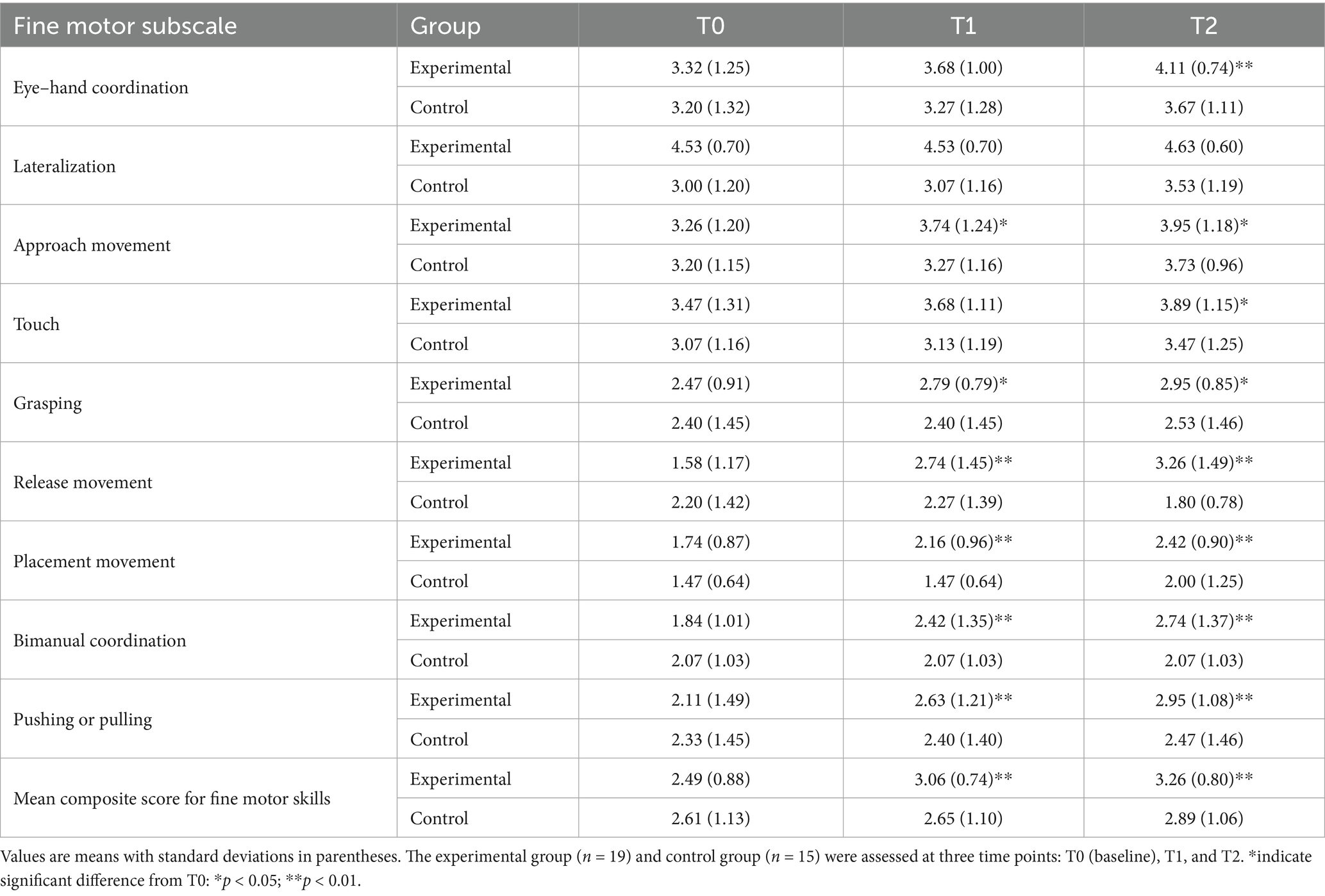 Table 4. Descriptive statistics of fine motor subscales at T0, T1, and T2 for experimental and control groups.