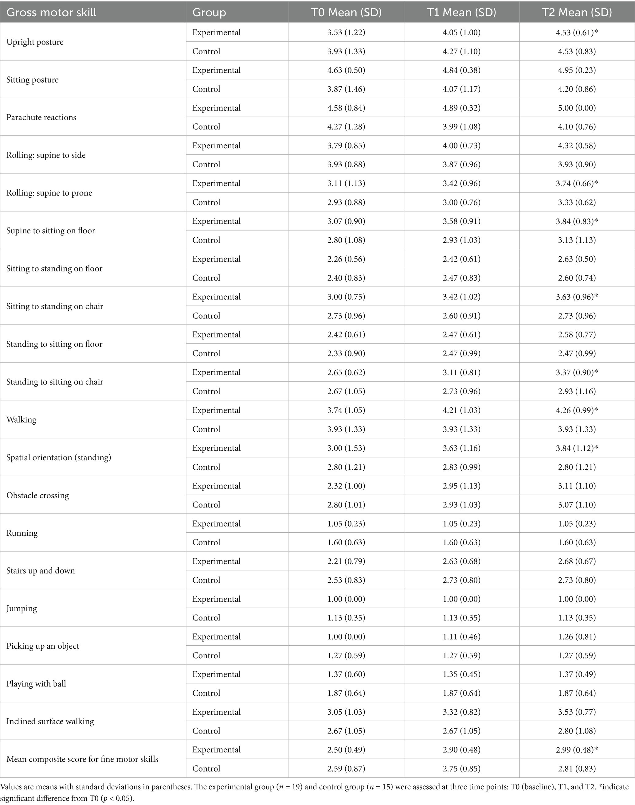 Table 5. Descriptive statistics of gross motor subscales at T0, T1, and T2 for experimental and control groups.