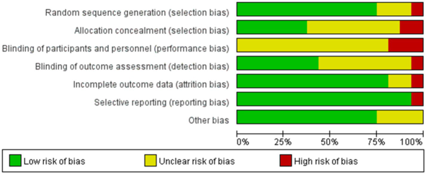 Two researchers independently assessed the quality of the included studies using the criteria outlined in the Cochrane Handbook for Systematic Reviews of Interventions (n.d.). The evaluation index includes the following seven items: randomization sequence generation, allocation concealment, a blinding method for study subjects and interveners, a blinding method for results measurement, incomplete result data, selective reporting bias and other bias. Each trial was rated as having a “low risk,” “unclear risk,” or “high risk” of bias. A study was classified as being at “high risk of bias” if two or more domains were identified as high risk. Discrepancies between the two researchers regarding the risk of bias were resolved through discussion or consultation with a third researcher.