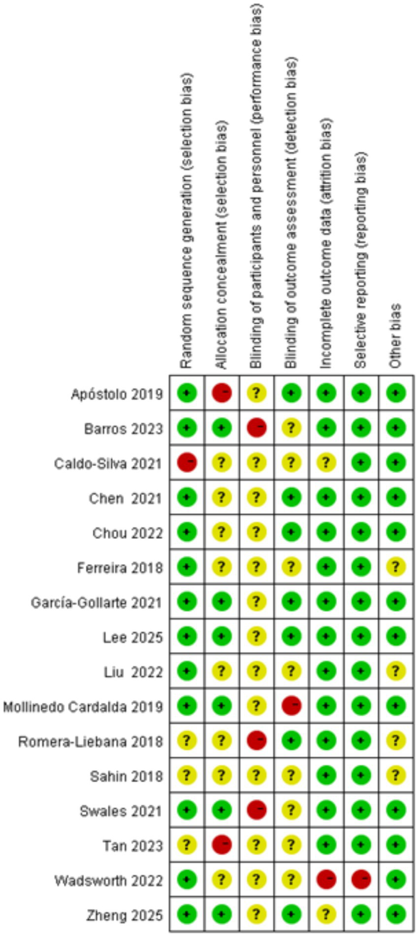 The exercise interventions included in the study were predominantly multicomponent training (e.g., strength training combined with aerobic, flexibility, balance, or resistance training), and other forms of intervention included vibration training (Wadsworth et al., 2022), tai chi (Liu et al., 2022), and acupuncture exercises (Chou et al., 2022). The control group received interventions focusing on routine care, health education and flexibility exercises. The duration of physical exercise ranged from 30 to 60 min per day, with a frequency of 2–7 days per week for 8–48 weeks. Follow-up ranged from 4 to 48 weeks. Treatment adherence was assessed by the percentage of training sessions completed, and participants’ adherence levels ranged from 63 to 95.84% in the included studies. Training venues included long-term care facilities (two studies) (Chou et al., 2022; Wadsworth et al., 2022), social geriatric institutions (four studies) (Ferreira et al., 2018; García-Gollarte et al., 2023; Lee, 2024; Sahin et al., 2018), and nursing homes (remaining studies) (Barros et al., 2024; Caldo-Silva et al., 2021; Chen et al., 2021; Liu et al., 2022; Mollinedo Cardalda et al., 2019; Romera-Liebana et al., 2018; Swales et al., 2022; Tan et al., 2023; Zheng et al., 2025). Professionals were responsible for managing and supervising the training programs: five studies were run by experienced physiotherapists (Chen et al., 2021; García-Gollarte et al., 2023; Lee, 2024; Romera-Liebana et al., 2018; Sahin et al., 2018), three studies were supervised by trained coaches (Chou et al., 2022; Ferreira et al., 2018; Swales et al., 2022), and a further four studies were directed by trained researchers (Tan et al., 2023; Wadsworth et al., 2022; Zheng et al., 2025). In addition, one study had a training program implemented directly by a sports specialist (Barros et al., 2024) and another had a training program designed by a sports specialist and conducted by a healthcare professional (Liu et al., 2022). However, two studies did not provide specific implementation information (Caldo-Silva et al., 2021; Mollinedo Cardalda et al., 2019). Detailed information about the included studies and their characteristics is presented in Table 1.