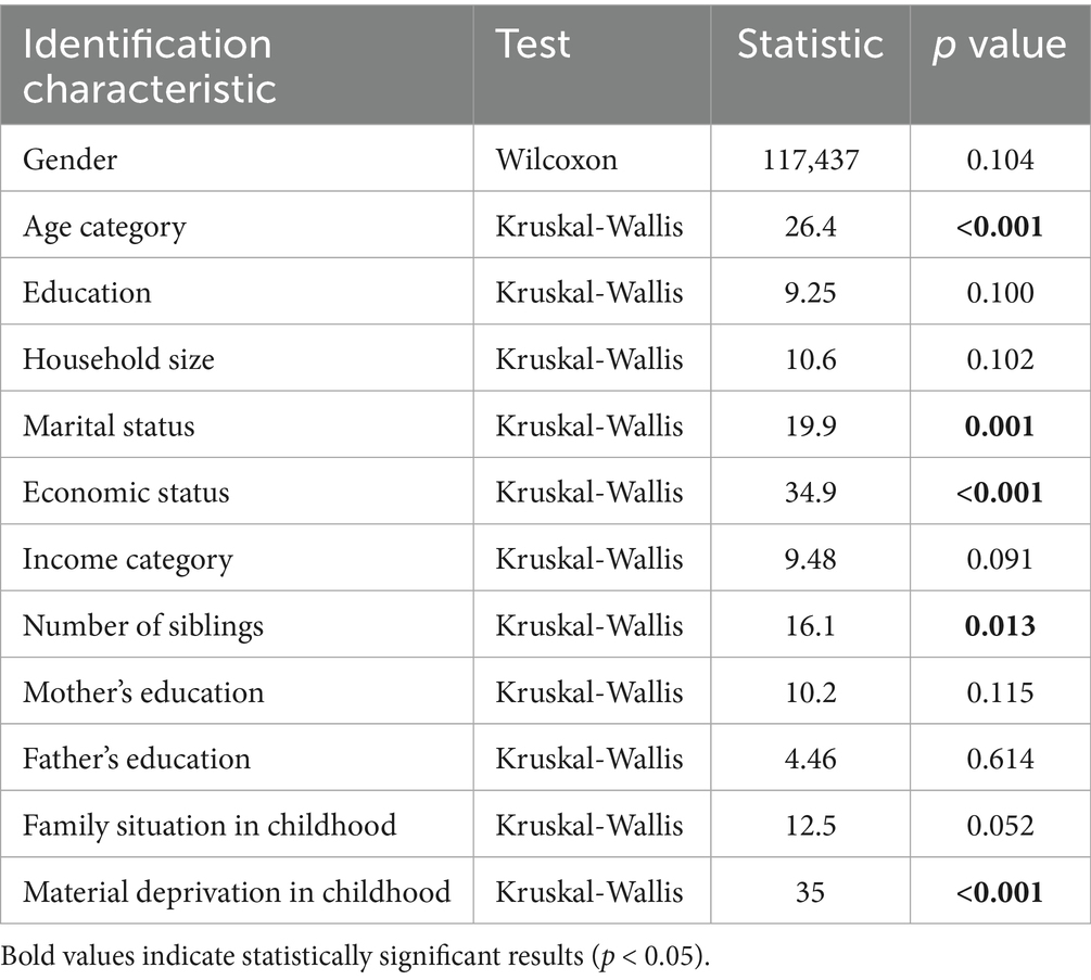 Table 1 provides the basic descriptive characteristics of the research sample. The distribution of respondents by gender, age, education, and other sociodemographic features indicates sufficient diversity, which increases the credibility of the findings. The sample predominantly includes young adults, which aligns with the research’s focus on the younger generation and their approach to sustainable behavior. The distribution of key variable values suggests balance and minimizes the risk of biased results. In addition to the identification characteristics presented, the research also works with the characteristic Type or focus of education (Economic (157, 15.7%), Humanities (135, 13.5%), Natural Sciences (61, 6.1%), Technical (305, 30.5%), General (342, 34.2%)), Size of place of residence (0–0.9 thousand (152, 15.2%), 1–1.9 thousand (145, 14.5%), 2–4.9 thousand (156, 15.6%), 5–19.9 thousand (163, 16.3%), 20–49.9 thousand (153, 15.3%), 50–99.9 thousand (93, 9.3%), over 100 thousand (138, 13.8%)), Personal net monthly income in EUR (up to 500 (192, 19.2%), 501–1,000 (396, 39.6%), 1,001–1,500 (263, 26.3%), 1,501–2000 (97, 9.7%), 2001–2,500 (25, 2.5%), over 2,500 (27, 2.7%)), Number of siblings (0 (91, 9.1%), 1 (353, 35.3%), 2 (294, 29.4%), 3 (155, 15.5%), 4 (64, 6.4%), 5 (32, 3.2%), 6 (11, 1.1%)), Mother’s highest attained education (primary (242, 24.2%), secondary without graduation exam (317, 31.7%), secondary with graduation exam (316, 31.6%), university degree I (22, 2.2%), university degree II (66, 6.6%), university degree III (8, 0.8%), do not know (29, 2.9%)), Father’s highest attained education (primary (164, 16.4%), secondary without graduation exam (395, 39.5%), secondary with graduation exam (278, 27.8%), university degree I (28, 2.8%), university degree II (69, 6.9%), university degree III (17, 1.7%), do not know (49, 4.9%)), During my childhood (I lived the whole time with both parents (812, 81.2%), my parents divorced/separated and then I lived only with my mother (112, 11.2%), my parents divorced/separated and then I lived only with my father (8, 0.8%), my parents divorced/separated and then I alternated between both (12, 1.2%), I lived only with my mother (43, 4.3%), I lived only with my father (4, 0.4%), I lived without parents (9, 0.9%)), During my childhood, in terms of material well-being, I felt (constant surplus of things I wanted (31, 3.1%), constant sufficiency of things I wanted (348, 34.8%), occasional lack of things I wanted (505, 50.5%), constant lack of things I wanted (116, 11.6%)).