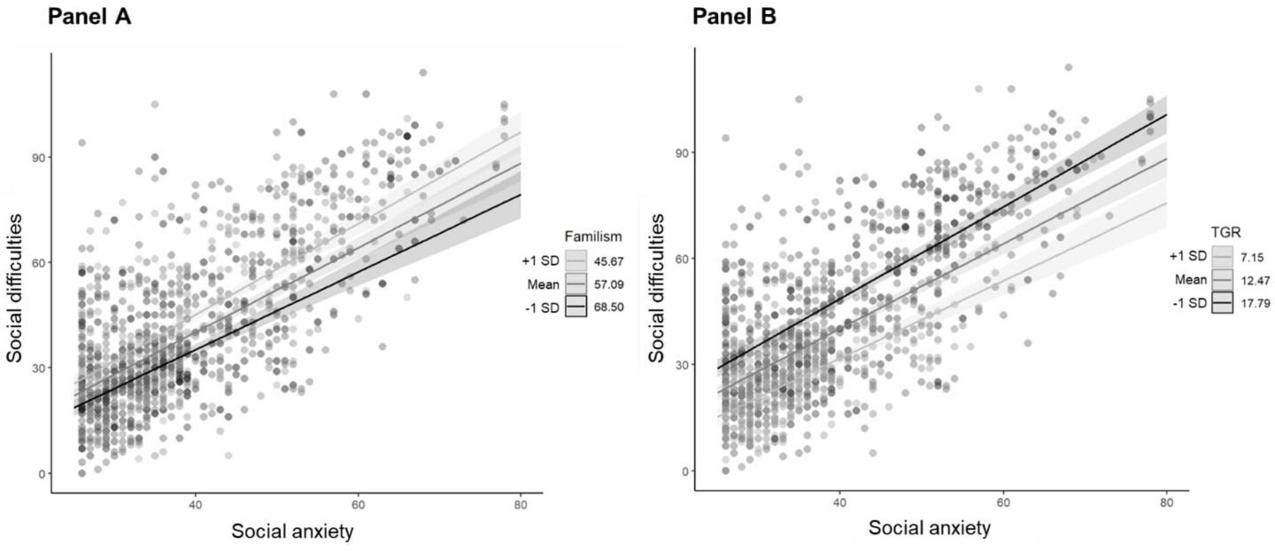 Figure 1. Significant interaction effects with social difficulties as dependent variable (A) social anxiety*familism; (B) social anxiety*TGR). Simple slope analyses are depicted. Bands represent 95% confidence intervals.