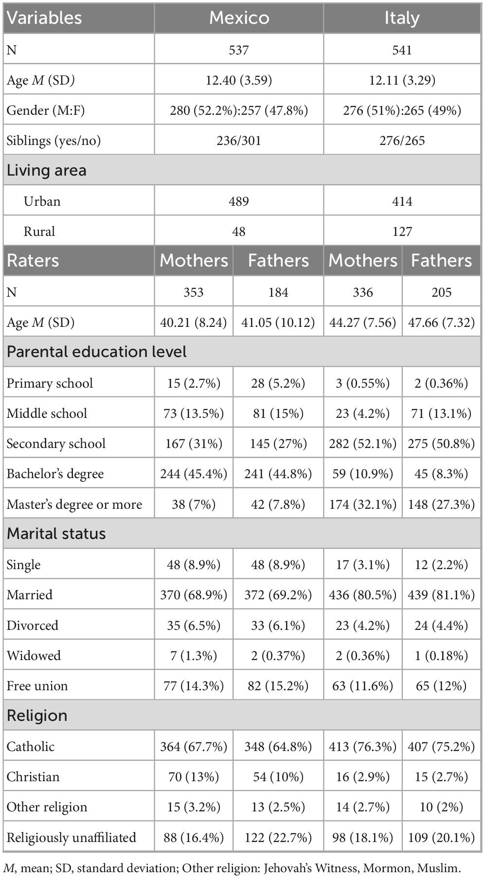 The initial sample included 1274 Mexican and Italian fathers and mothers of children and adolescents between 6 and 18 years. Parents were asked to answer an online survey on their children’s traits and abilities, such as social difficulties, social anxiety, and family cultural values. The survey also included a socio-demographic questionnaire at the beginning, gathering information about the child (i.e., sex, date of birth, any medical or neurodevelopmental conditions). Moreover, in this initial part of the survey, parents were asked to provide information on the respondent’s role (mother, father), their date of birth, educational background, religion, marital status, number of children, and whether they reside in a rural (i.e., a zone with low population density and limited access to services) or urban area (i.e., a zone with high population density and wide access to services).